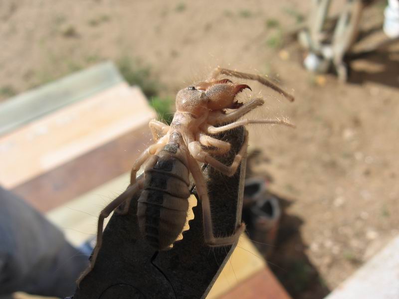 Это паук фаланга, теоретически не ядовит, но ест других пауков, на клещнях остаётся яд. Могут быть достаточно здоровые до 5 см.