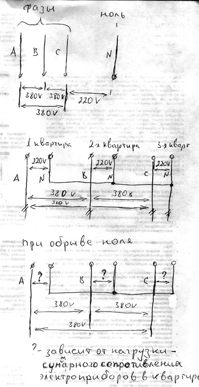 Я расскажу по своему, Колючему. Без доказательств - сеть кругом трехфазная, между любой парой фаз - 380в, между любой фазой и нулем - 220в. Нагружать одну фазу, не нагружая другие, нельзя. Поэтому потребителей "раскидывают" по фазам равномерно. Итак, имеем три квартиры в трехфазной сети с общим нулем (верхний рисунок). У каждого 220в. Для наглядности рядом нарисованы весы, и иллюстрирующие физику процесса между квартирами 2 и 3. Пока ноль цел и держит весы в равновесии, независимо от нагрузки на чашках весов. При обрыве нуля (нижний рисунок), фаза "В" пройдя через нагрузку квартиры 2 и остаток нулевого проводника между квартирами 2 и 3 попадает на нагрузку квартиры 3. Фаза "с" аналогично на нагрузку квартиры 2. Если нагрузки одинаковы, то потребители квартир 2 и 3 могут даже не почувствовать обрыв нуля. Но что чаще всего, в одной из квартир нагрузка больше (сопротивление меньше). В данном случае это квартира 3. 380вольт межфазного напряжения начинают делится между нагрузками неравномерно. Без привязки к нулю весы перекашиваются. В квартире 3 включен чайник и на нем 20 вольт, а в квартире 2 лампочка и на ней остаток - 360 вольт. Лампочка с треском взрывается! А жильцы квартиры 1 ни сном ни духом - у них все хорошо!