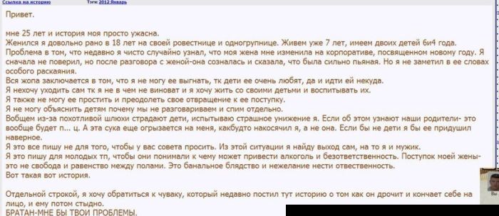 nosferatos, не видел Приходит казак домой, после пьянки с дружками, ну и после полуночи. Входит в горницу, а его жену какой то мужик тр%%ает. Казак подбегает к кровати, хватает мужика левой рукой за достоинство а правой тянется к шашке, что на ковре висит. Да не достает, изо всех сил старается. А достоинство то мокрое, скользкое. Ну и вырвался мужик да в окно. Казак не долго думая срывает с ковра ружье, стреляет вдогонку. Гворит "Кажись промазал". Потом сел, почесал репу и изрек "Твою жешь мать, он мою жинку тр%%нул, а я ему *** обтер да еще салютом проводил".