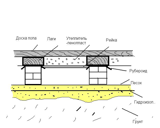 А если в полу или плинтусах сделать вентилируемые отверстия? Конструкция, эксплуатируемая в настоящее время, как раз так и устроена. За исключением линолеума. Гниения полов не обнаружено. Все превратилось в трусу от жука-короеда. За эскиз спасибо. Все понятно. Но есть вопросы. Почему рубероид нужно красть на грунт (у нас грунт песок)? Я думала, что между столбиками можно засыпать керамзит. Горизонтальная поверхность столбиков гидроизолируется рубероидом. Далее лаги. Вместо минват вполне логичнее использовать пенопласт. Он легче и не впитывает влагу. Желание есть! Сфоткайте пжлста!!!