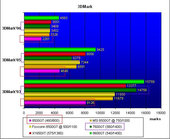 вот почитай http://www.overclockers.com.ua/video/geforce-low-end-7600-8500/ это 8500 с DDR3 добавлено через 2 часа 23 минуты у меня Mark06 дает 3692 попугая