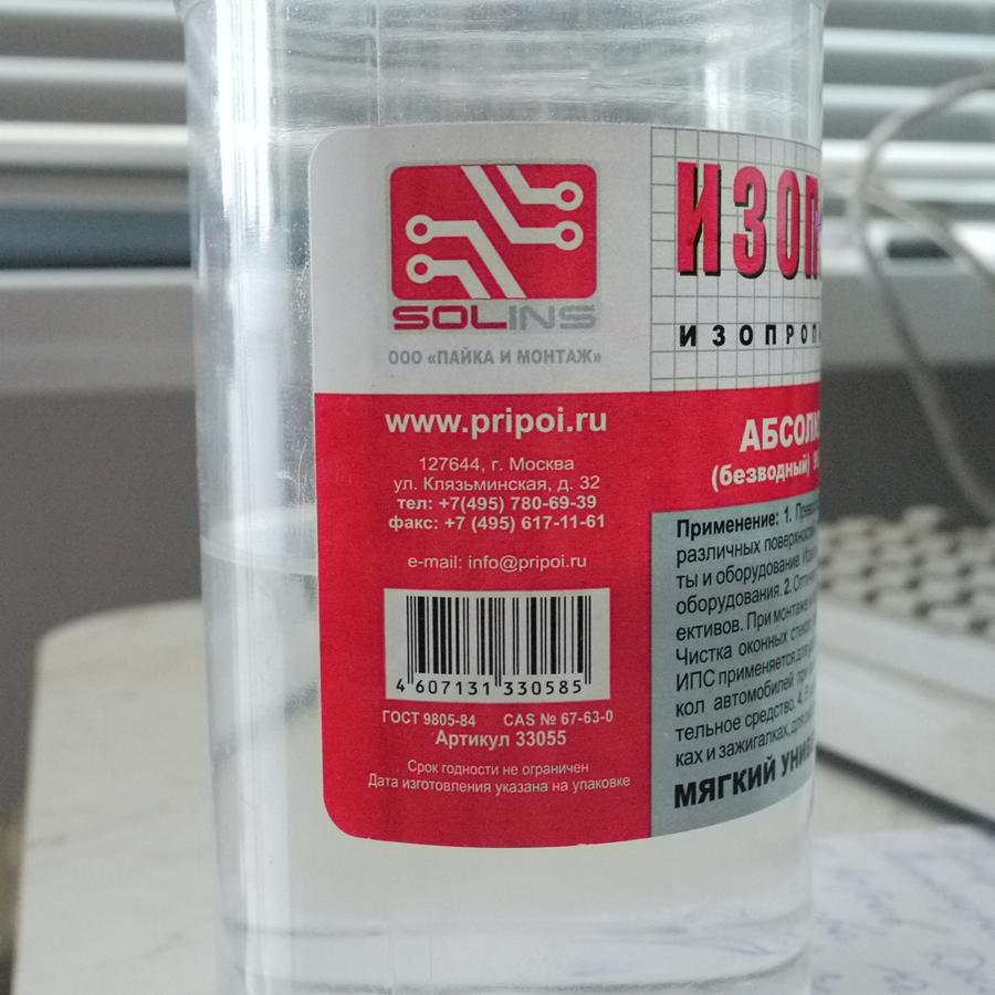 Сильно удивлюсь, если ХЧА этанол способен следы на стекле оставлять Подозреваю, что просто чистый метанол легче получить, чем этанол, потому что он легче возгоняется. В общем, такой вот у меня изопропанол. Куплен был года два назад что-то такое меньше сотни рублей за 0,5 литра. В основном спирт тратится на то, чтобы следы скотча оттирать с различных поверхностей Сейчас капнул на зеркальце, высушил, и белый след остался только по краю. Зеркало перед опытом только протирал, так что это, скорее всего, грязь с самого зеркала. Для чистоты эксперимента надо было бы, конечно, очистить стекло как следует, но неохота. После высыхания основного слоя остались мелкие капельки, которые высохли позже, но разводов не оставили. Наверное, это и есть примесь воды. Но в любом случае по центру пятна следов нет, так что результат теста можно считать удовлетворительным. Матрицы со спиртом никогда не чистил. Меня полностью устраивает технология: дыхнул, проехался ватной палочкой (~10 копеек штучка). На чистку уходит несколько палочек. Таким способом за 3-5 минут получаю ровное небо на дырке 11 и еле заметные пятна на дырке 16. Больше трёх тестовых кадров делать не приходилось ни разу. Как бы, конечно, есть некоторый риск поцарапать стекло таким образом, но не думаю, что он сильно выше, чем если шваброй чистить. Грязь на матрице лучше всего видна, если приноровиться под нужным углом светить фонариком. С солнцем и лампами видно хуже. Этими же ватными палочками по той же самой технологии протираю видоискатель и края линз.