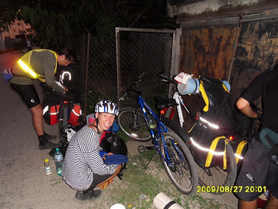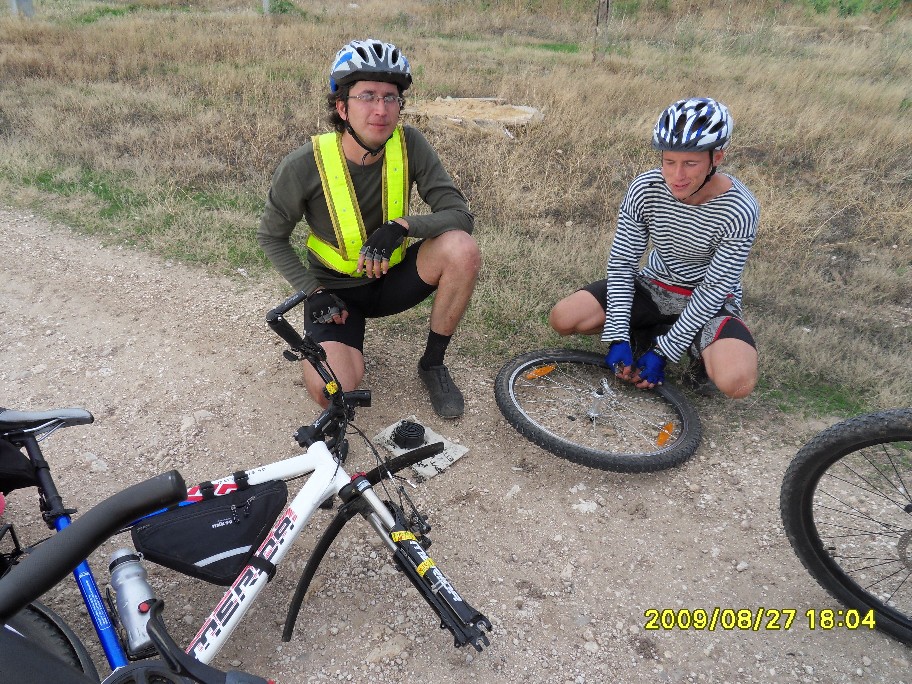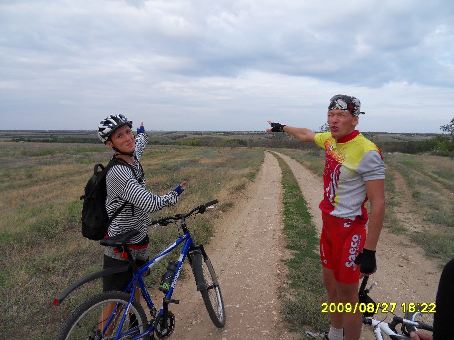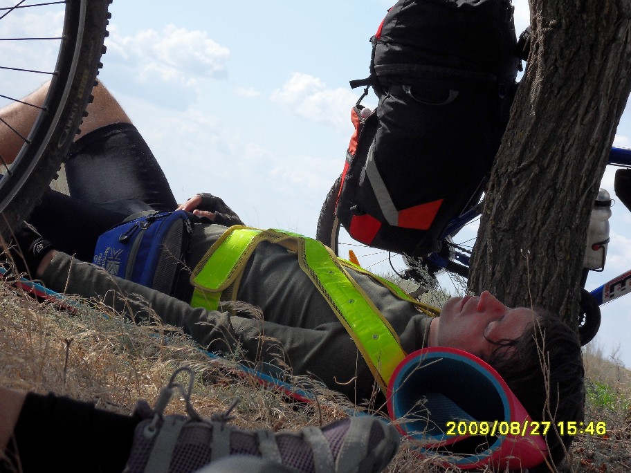 Как начиналась и развивалась покатушечная часть программы все уже примерно поняли. См: http://www.forum-volgograd.ru/showthread.php?t=137102&page=2 Начиная с 13.30 и отсоединения Blinoff`а, по одному стали отклеиваться участники, подписавшиеся только на первый день ПВД. Андрей и его добыча: В 18.30 с уходом Димок7 остались пять человек, для которых основная часть была еще впереди. Вот про ПВД я и напишу. Мои опасения, что план на день первый у нас малореален, только укрепились, когда к обеду, состоявшемуся в полдень, позади осталось меньше трети планируемого дневного пробега. Когда Димок7объяснял нам дорогу до Орловки... ... я озвучила Веронике свое видение идеального завершения дня: в Волжском мы в сумерках, на стоянке (в Средней Ахтубе) только ночью. В районе 16 часов была еще остановка на... м-м-м... полдник: На этой остановке Angel of low flight умер: Думаю, предысторию знают не все. Дело в том, что Angel of low flight, опоздавший на электричку, догонял нас своим ходом (я в это до сих пор не верю, все кажется, что это шутка). Так что у него километраж существенно выше нашего. На этом его злоключения не кончились. Начало спускать колесо. Он его все подкачивал, пока я не предложила, наконец, заменить камеру. Не настолько же мы спешим, в самом деле. И вовремя, потом, в темноте, это было бы проблематичнее. Сейчас пытаюсь вспомнить, какие были ощущения дальше, и не получается. Видимо, все было штатно. Фото помогают вспомнить детали. В 19 часов мимо нас проезжали пара мальчишек. У второго было спущено колесо, на что ему указал Angel of low flight. «Знаю» - отмахнулся мальчишка и хотел двинуть дальше, как наши решили протянуть руку помощи. dimazik накачивал колесо, пока я комментировала в таком вот духе: «Цепь там смазать не забудьте! А может втулки переберем, а?». К 20 часам были на Спартановке. Здесь мы набрали воды в кучу заранее запасенных емкостей, большинство из которых потом везли Порто 32 и Angel of low flight. У dimazik`а был только заплечный рюкзак, но и туда чего-то напихали. Потом закупились провизией на ужин в магазине. К вечеру ветер стих, ехалось на удивление комфортно. Мышцы в полном порядке, коленки, начавшие бастовать еще к обеду, протест сняли – спорт лечит! Вылезла главная проблема больших расстояний – скучно. Порто 32 упорно игнорировал остановки Ничего, когда-нибудь мы его научим различать марафоны и покатушки Никто почему-то не возмущался. Вот терпеливый народ попался! И все-таки иногда Порто 32 приходилось остановиться, чтобы посоветоваться насчет чего-нибудь, и этот шанс мы не упускали - тут же доставали заначки из карманов и сумок. Как-то спросили dimazik`а, не устал ли он, а то он с нами в покатушке первый раз. «Я устал еще 40 километров назад» - буднично ответил он. Да, усталость – странная штука. И как мы ездили без второго, третьего дыхания? Уже полная темнота: вот ГЭС и Волга, вот они уже позади, знакомый маршрут через Волжский (одна ни за что не найду), вот мы на пустынной трассе, на остановках уже прохладно. Трасса тянется, тянется… Еду и думаю, что бы я хотела сейчас съесть. Потом думаю, что мы будем есть на стоянке. О чем ни подумаю – все такое вкусное!! Кончилась – сверток на какую-то менее значимую дорогу с кучей трещин. Они уже чувствительны. Тыдын-тыдын… Кончилась – пошел грунт. В одном месте в колее вода, но не влезли. И-и-и… стоп. Приехали. ПРИЕХАЛИ!!! Мы на берегу Ахтубы, проехав за день с рюкзаками 130 км! Вот это мы-ы! Посиделки