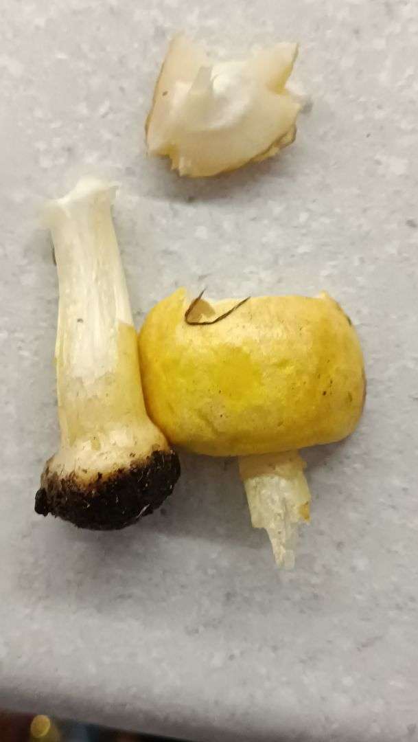 Что за гриб? Длиной 5-6 см. Был белого цвета. Полежал в воде - стал сверху желтым. Пластинки белые. Вроде, без запаха. ЗЫ: был сорван, как шампиньон. Разумеется, выкинул.