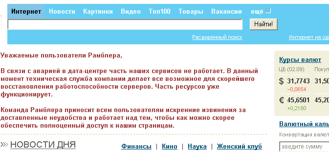 Вот на оффсайте : Уважаемые пользователи Рамблера, В связи с аварией в дата-центре часть наших сервисов не работает. В данный момент техническая служба компании делает все возможное для скорейшего восстановления работоспособности серверов. Часть ресурсов уже функционирует. Команда Рамблера приносит всем пользователям искренние извинения за доставленные неудобства и работает над тем, чтобы как можно скорее обеспечить полноценный доступ к нашим страницам.