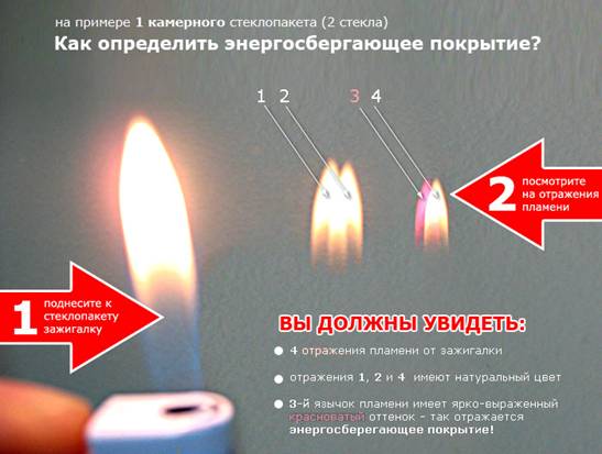 Должен быть энергосберегающий стеклопакет.Ну подносил я спичку что я должен увидеть? ---------- Сообщение добавлено 26.08.2011 19:41 ---------- Поднес спичку отражаются (горят) 3 огонька, 2 из них желтые 1 красноватый (заметно отличается от 2 других)