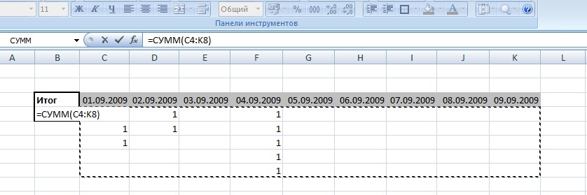 Дальше выделяешь ячейки которые нужно сложить и жмёшь ентер. добавлено через 7 минут Кстати, в экселе есть достаточно подробная справка по формулам...