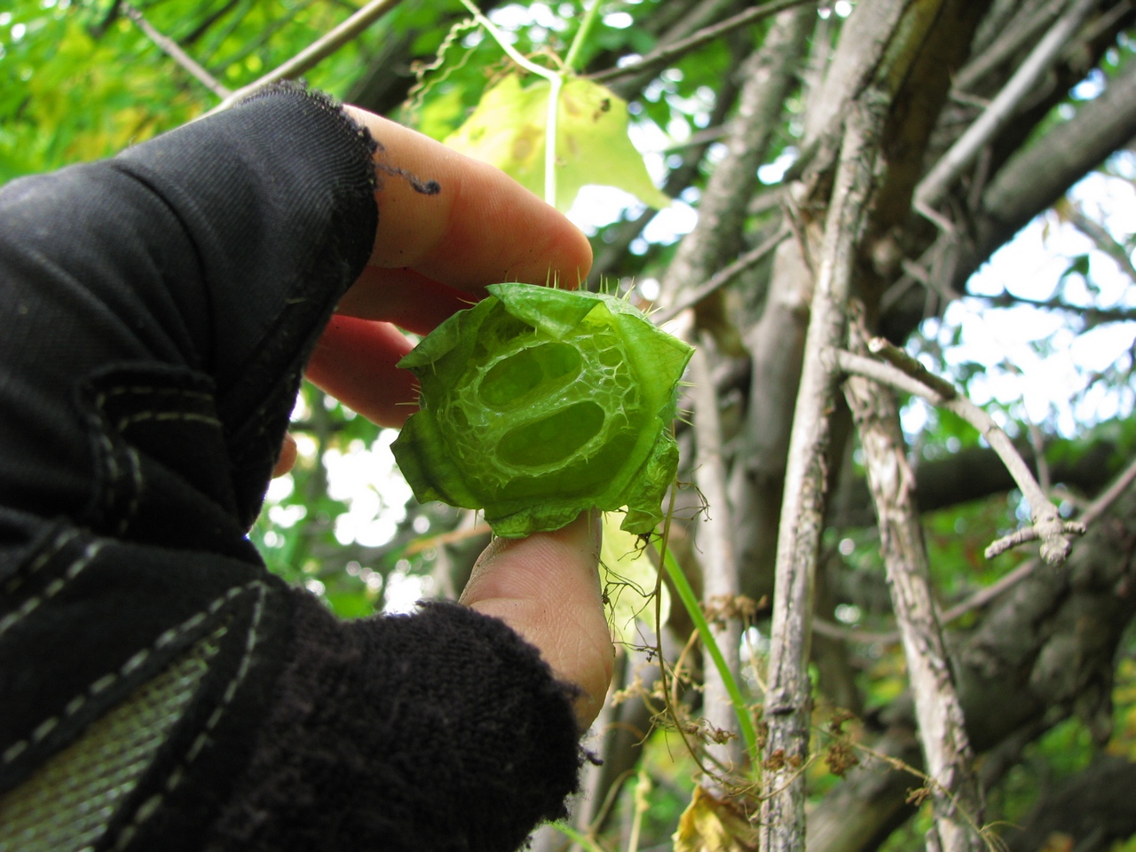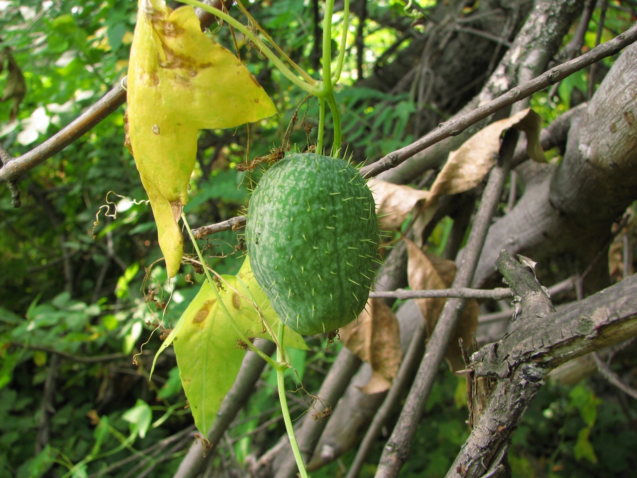 Кстати, когда мы пробирались сквозь чащу , я даже не знаю как это точнее назвать, это место было похоже на настоящие джунгли.Такого буйства растительности мне не еще приходилось видеть в нашей области... Все обратили внимание на странные лианы опутавшие стволы деревьев,они были усеяны колючими шариками. fb03 предположил ,что это дикий хмель, но это был не хмель. Это легендарный "Бешеный огурец" (Ecballium elaterium) "Произрастает на Азорских островах, в Средиземноморье, в Малой Азии, а также на юге европейской части России, в Крыму и на Кавказе,растение ядовито. Это растение не напрасно называют «бешеный огурец»: к моменту созревания плодов в них возникает колоссальное гидростатическое давление (почти 6 атмосфер). Даже легкое прикосновение к созревшему плоду вызывает потрясающий эффект. Бешеный огурец стреляет по принципу пистолета-распылителя. В одно мгновение огурец отрывается от плодоножки, а из образовавшегося в основании плода отверстия выбрасывается сильная струя клейкой слизи, увлекающей за собой семена. При таком «артиллерийском обстреле» семена выбрасываются растением на расстояние более 12 м. Шерсть животного, потревожившего заросли бешеного огурца, моментально оказывается облепленной окруженными слизью семенами. Слизь постепенно высыхает, и семена одно за другим отваливаются, распространяясь таким образом на дальние расстояния. В народной медицине и гомеопатии применяют сок недозревших плодов. Большие дозы сока плодов могут вызвать серьезное отравление. " В общем мы еще легко отделались, все обошлось лишь проколотыми шинами