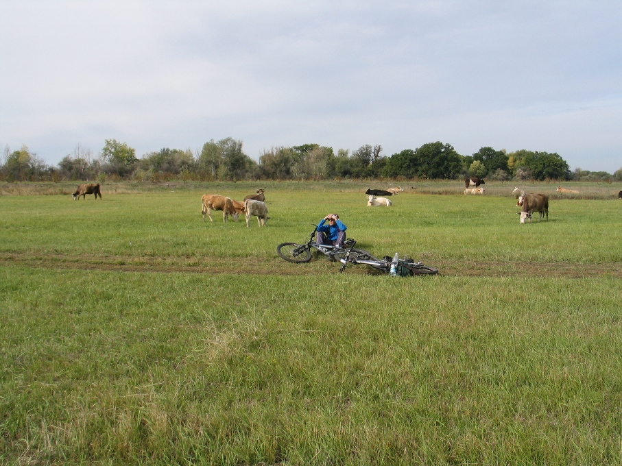 Замечательно прокатились благодаря раннему сбору в 8 утра, хотя я как обычно опаздывал и тяжко вкручивал на паром, кляня свою нерасторопность, и неуместный встречный ветер. Только после оплаты проезда вспомнил что через мост пускают, ну да ладно попрощались с паромом. На середине переправы я окончательно остыл от гонки и начал от прохлады просыпаться Небеса не спешили умываться от облачности, потому Ярило жарило тучи а на землю тепло не попадало, но нам ли быть в печали ? Благодаря алюминевым дружищам прохладу ощущали только уши и то в начале, пока были на асфальте... . В окружении деревьев и ериков, вперемежку с коровами, щенками, баранами, грибниками, рыбаками,утками,цаплями - километры наматывались только на велокомпьютер, минуя внимание И некоторый осадок появился на картах......, картах памяти фотоаппарата