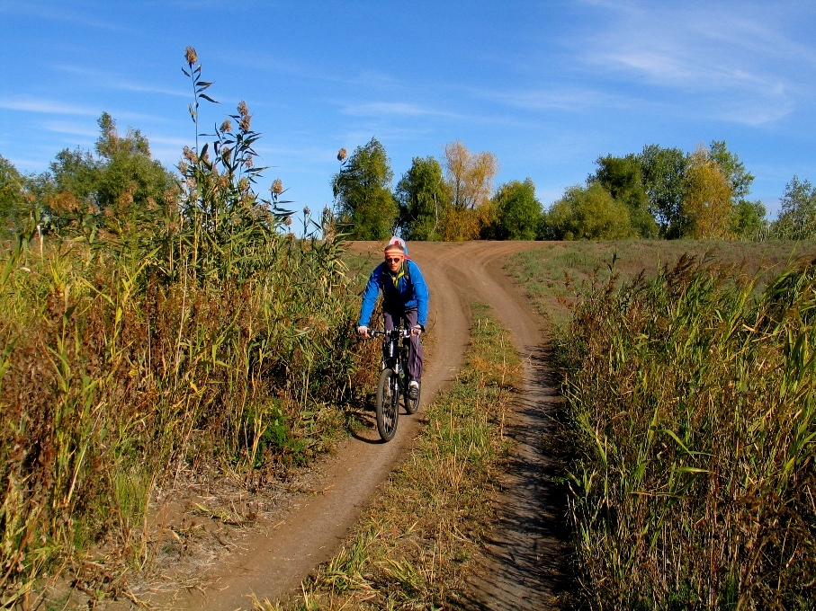 Небольшая зарисовка о незапланированном походе ...Утром, все кто собирался ехать, собрались на пароме. Собравшихся было трое:Сергдж, dimazik и я (PSV). Думалось, что это последняя поездка на пароме-ведь в понедельник должны ОТКРЫТЬ МОСТ и паромная переправа канет в лету. Переправившись на левый берег, мы поехали по Краснослободску в сторону ер. Судомойка. У "Пятерочки" наша группа разделилась: dimazik поспешил по своим делам, а мы с Сергджем по очереди "нырнули" в магазин закупиться провизией. ... После магазина мы направились в п.Сахарный. Так как с открытием моста основной грунтовый путь в пойму теперь будет лежать через этот поселок, мы решили получше разведать кратчайшие пути и просто поездить по новым местам в "ближней" пойме. Для этого выбирали дороги, по которым мы еще не ездили. GPS с утра отказался работать, поехали "по солнцу", благо оно было. Сразу за поселком хорошо накатанная дорога идет сначала по большим полянам, потом по лесу. Здесь мы проезжали в мае этого года, в разгар половодья, переходя иногда вброд заполнившиеся водой низины. а сейчас здесь сухо. Через 3,5 км выехали к дачам, затем пересекли грейдер Закутский- Тумак и двинулись дальше. Через несколько км выбранная дорога привела нас на берег небольшого озерка и ...закончилась. Озеро было очень красиво, мы сфотографировались и отправились обратно. Через несколько десятком метров в сторону уходила еще одна дорожка, которая тоже скоро закончилась.Перед нами был сухая ложбина, по которой можно было все же ехать. Правда, на нашем пути встречались иногда препятствия, которые мы с успехом преодолевали. Выйдя снова на дорогу, мы покатили по изумительному участку леса со стройными рядами тополей, небольшими полянками и отличной дорогой. Скорость наша, к моему удивлению, была совсем невысокой-15-17 км/ч. Мы ехали не спеша, разговаривали, наслаждались великолепием осени и отличной погодой. Через некоторое время лес закончился и мы оказались на большом лугу с пасущимися на нем коровами. Большинство из них лежало, нежась в лучах "нежаркого" солнца. Мы остановились и немного понаблюдали за ними. А они - за нами. Вообще, в этой поездке мы постоянно встречали домашних животных- то коров на лугах, то ленивых овец, даже не встающих при нашем приближении, то большую группу(шт. 8-10) щенков, неизвестно как оказавшихся на берегу заросшего камышом ерика. Да еще в приличном удалении от населенного пункта. На отдельных озерах видели водоплавающих: лысух, крякв, цаплей. В лесу часто попадались грибники и охотники. На обед мы остановились на берегу живописного ерика Свинуха. Я пробовал половить хищника, но без результата. Мелковато, а может и вода еще теплая. Обратно, в сторону дома, мы тронулись необычайно рано-в половине четвертого и через два часа были уже на мосту через Волгу.. Здесь нас охрана направила на пешеходную дорожку.Надеюсь в последний раз. Ехать по ней крайне неудобно.Особенно, если на ней находятся пешеходы. Итого, проехали за день грунтами 90 км. Немного устал, но уже дома чувствовал себя хорошо. Впечатления от поездки самые наилучшие: хорошая компания, красивая осенняя природа, солнечная погода, великолепная дорога (гораздо лучше, чем летом). Много запоминающихся моментов. Ну, что же, значит повезло. Надеюсь, что не в последний раз .