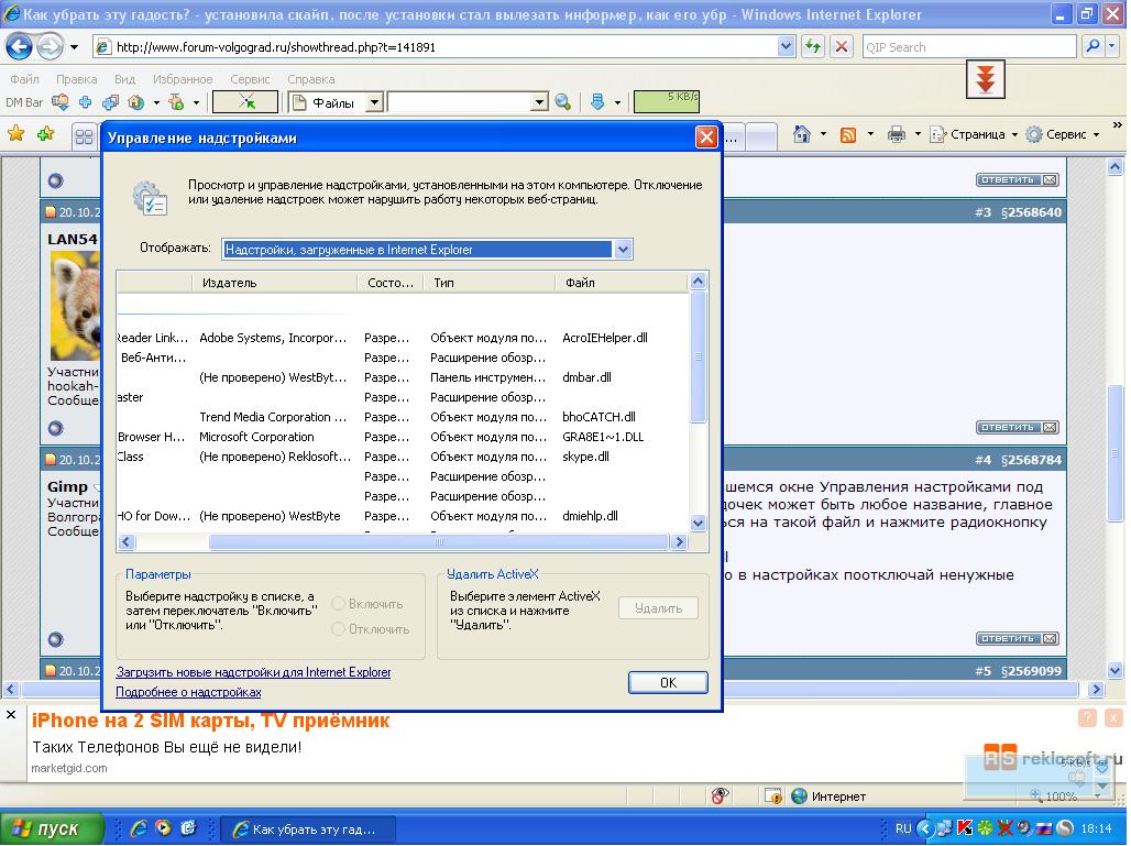 Да вот же он: skype.dll !!! Вот эту надстройку и отключите. А вообще, Вам же эта хрень сама представилась: "reklosoft.ru" Вот тут много про него интересного: http://blogs.pcmag.ru/node/1131?page=1 добавлено через 5 минут Увы, это уже не панацея