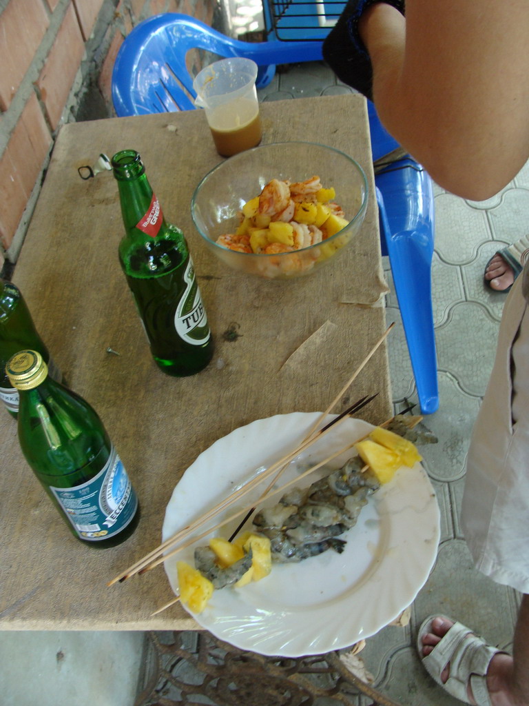 Креветки желательно сырые, на деревянных шпажках жарил на углях с кусочками свежего ананаса, готовятся 5 минут, к ним соус подается медово-соевый...