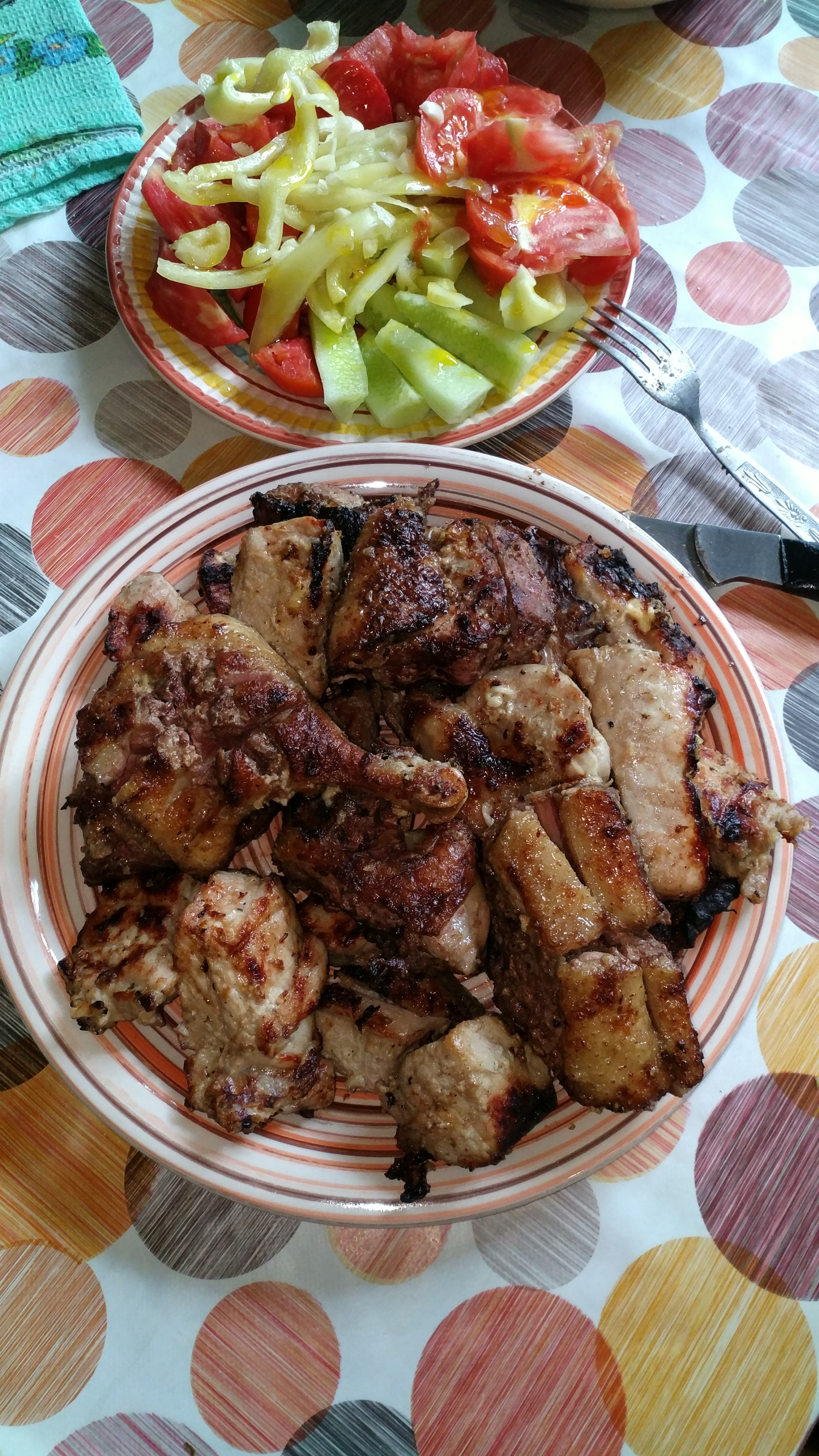 Мы помимо мяса, овощи же ещё жарим. Чаще всего, либо целиком, либо кусками. А вот шампиньоны, больше люблю когда в маринаде полежат. Сметана, соль, перец. Кабачки хорошо съедаются, кружками. И перец красный болгарский, когда прям хорошо запекается, чтобы не сырой.