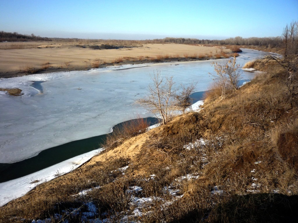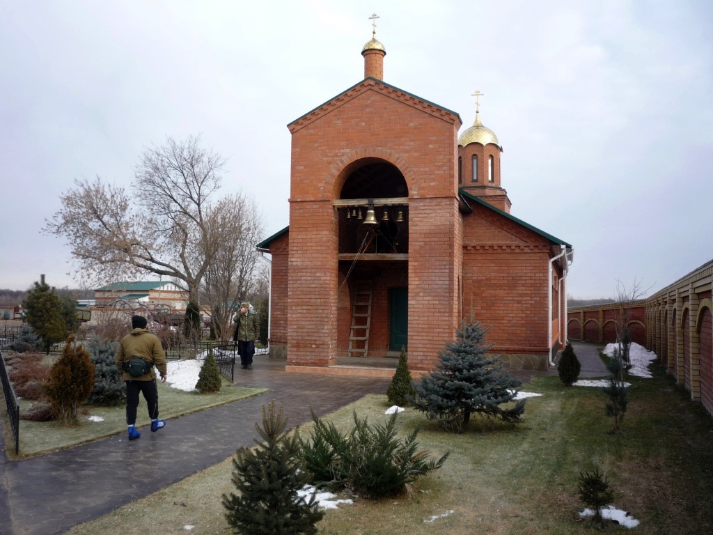Я рано ложиться за Волгой не привык, потому засиделся у костра. Звезды на небе - не то что с горошину, с яблоко! И лучистые такие... все-таки зимнее небо неподражаемо. И если бы не боль, которая мешала мне запрокинуть голову, я бы долго смотрел на эти звезды. После обеда я с размаху грохнулся левой стороной спины об лед - ноги выскользнули из-под меня так, будто их выбили сильным внезапным ударом. И после этого левая сторона шеи начала болеть, не давая запрокинуть голову и повернуть ее влево. К одиннадцати часам вечера температура упала до минус 16 с половиной градусов. В бархатной темноте перемигиваются заволжские огни, лучится звездами небо, потрескивает костер, ни ветерка... хорошо! Мысли текут неспешно, вокруг тишина, разве что иногда всхрапнет кто-то в палатках, и снова только потрескивание дров в костре да гулкие раскаты - лопается на Волге лед. А с фарватера иногда слышно, как чавкает дизелем судно, с протяжным грохотом ломает лед, и обломки из-под форштевня гремят-катятся наперегонки. Будто идет вдалеке и никак не пройдет поезд. Судно ушло за косу - и снова тишина. Пока я сидел у костра наедине с ночной Волгой, испек в углях оставшуюся картошку - иначе завтра ее, замерзшую в камень, пришлось бы выбросить. Съел одну, выяснил, что получилось вкусно, и пошел спать. Спалось хорошо. Несколько раз я просыпался, но не от холода, а от желания перевернуться на другой бок. И, переворачиваясь, понял, что шея моя решительно возражает против идеи продолжить поездку вниз по Волге. Так что, когда утром пришло время решать, еду я дальше или возвращаюсь, особых сомнений у меня уже не было. Я решил ехать домой со всеми вместе. Но перед возвращением домой мы решили проехать вниз по Волге еще километров пять-семь до Барбашей, чтобы посетить монастырь. И, надо сказать, эти километры скучными не были. Свидетельствую: лед там был высококачественный. Теперь я постоянно болтался в арьегарде, стараясь свести риск падения к минимуму. Пришлось осторожничать, потому что падать еще раз уж очень не хотелось. Погода с утра была почти пасмурной, но когда мы добрались до монастыря, стало проглядывать солнышко. Нам повезло - мы подъехали как раз без минут двенадцать. И только мы вошли на территорию, как звонарь начал вызванивать полдень (или как это правильно называется?). Я даже двух-трехминутный видеоролик снял, со звуком. Осмотрели монастырь и двинули на выезд из Барбашей. И, мало-помалу, добрались до Репинского асфальта. Доехали по асфальту до Кривуши, свернули с асфальта, проехали через село, переехали по льду ерик и выбрались на вал. Планировалось выехать на Ямы, а с них - на Сахарный. Но постепенно выяснилось, что Ямы мы объедем и выедем сразу на Сахарный. Пересекли Рассветовский асфальт. Солнышко уже светило вовсю, так что взбираясь на очередной вал, мы попали в грязь. Южный склон вала солнце прогрело настолько, что и при семи примерно градусах ниже нуля, земля оттаяла. На очередной развилке мы, посомневавшись, все же поехали прямо вместо того, чтобы свернуть влево - и вместо Сахарного выехали снова к Рассветовскому асфальту, на Фрунзе. Время нас уже поджимало, разыскивать дорогу на Сахарный мы не стали, а поехали по асфальту - до поворота на Рассвет, примерно 5-6 километров, и до моста - еще примерно столько же. Около половины пятого мы были на предмостной развилке. Там Tolibanych!!! попр