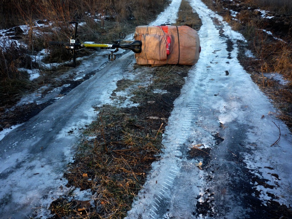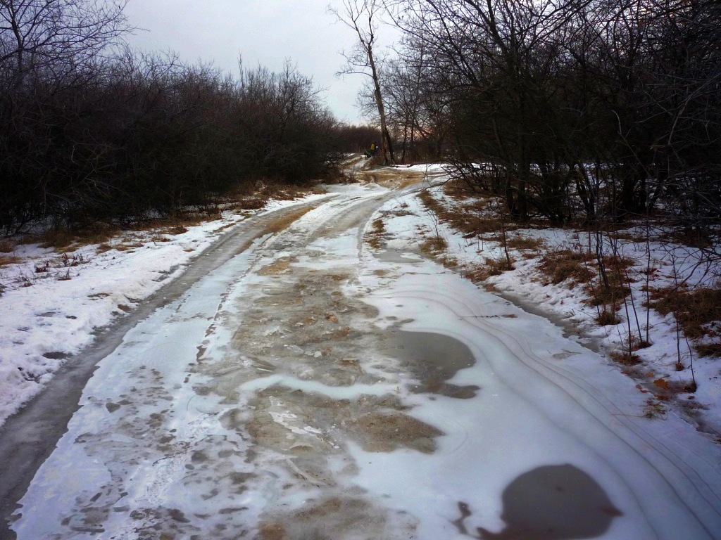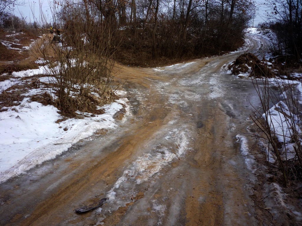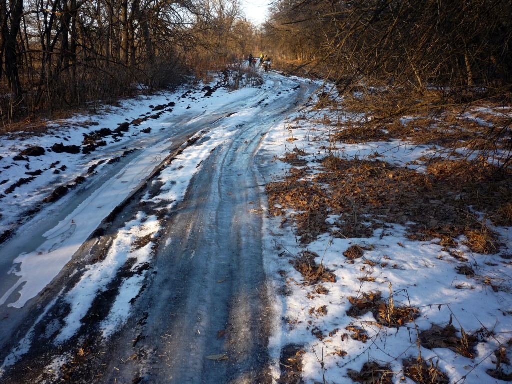 Уже давно тому, кто-то мудрый сказал: Дважды в одну реку не войти. И, конечно же, был прав. Но я все же решил попробовать. Решил сделать что-то вроде поездки в Каршевитое (см. "В Каршевитое и обратно за три дня"). Задумано это было как четырехдневный выезд... куда-нибудь вниз по Волге - куда доеду за два дня. Выехать я планировал 4 января, в первый же морозный день. Но PSV предложил перенести выезд на пятое, чтобы первый день можно было проехать вместе. Он планировал выезд с одной ночевкой, и ехать собирались еще Sasha Pronin и Tolibanych!!!. На том и порешили. Они после ночевки поворачивают домой, а я еду дальше. Но... гладко было на бумаге, да забыли про овраги. С утра 5 января термометр показывал минус 14, небо ясное - все обещало прекрасный день. Дорога по городу и через мост была самой обычной, чистый асфальт, небольшое движение - ничего особенного. В хорошем темпе доехали до Слободы, где к нам присоединился Tolibanych!!!. После закупок в Слободском магазине мы поехали на Сахарный, и я уже сказал себе: Ну, наконец-то я запомню дорогу от Сахарного на Ямы! Наивным я был... До Сахарного асфальт тоже был чистым, и мы как-то очень быстро доехали до места, где надо было сворачивать на грунт. И там взгляду моему представились две извилистые полосы неровного льда, между которыми изредка проглядывала земля. У PSV была четырехрядная шиповка Nokian, у меня - тоже шиповка, и тоже Nokian, только двухрядная. У Tolibanych!!!'а была российская резина, которую он сам зашиповал, изнутри вкрутив в каждый грунтозацеп по шурупу так, что их острые концы торчали наружу и выглядели весьма агрессивно. И только Sasha Pronin ехал без шипов, на мягкой резине, которая под его весом прожималась почти наполовину. Сказать, что по той дороге мы ехали, было бы неверно. Гораздо точней будет сказать, что мы прокрадывались. Даже PSV на четырехрядке на том льду приходилось осторожничать. Мне на двухрядке очень быстро стало понятно, что ехать надо так, будто никаких шипов у меня нет и в помине. Tolibanych!!! на самодельных шиповках ехал уверенней меня, но если была возможность объехать лед, он его объезжал. Только вот возможность такая была не всегда... Падали все. Да и как не упасть, если по дороге, когда она была еще снежной, машины накатали колеи, между которыми остались ледяные гребни? Тут и четырехрядная шиповка не спасет. Я падал чаще, чем ожидал - видимо, и потому, что уж очень давно по такому льду не ездил, и потому, что рюкзак у меня оказался больно тяжелым - я вез продукты на четыре дня, ремнобор и т. д. Мои надежды на шипы не оправдались, все же 2 ряда - мало. Например, в ту гору, которую PSV одолел в седле, я долго и упорно вползал пешком, то и дело замирая в самых нелепых позах. Вел регулярно пытался встать на дыбы и стащить меня вниз, и один раз у него это получилось - мы с ним сползли юзом метра на полтора. PSV в это время, стоя на вершине, увлеченно снимал мою, как он позже выразился, Кама-Сутру с подъемом. Будем надеяться, фотки он выложит. В общем, скучно не было, отнюдь. Было весело и интересно. На удивление уверенно ехал Sasha Pronin. Можно смело говорить, что в его случае качество прокладки между седлом и рулем оказалось на высоте. Несмотря на отсутствие шипов, бОльшую часть покатушки лидировал он. Может быть, отчасти потому, что груз у него, думаю, был небольшим, и вез он свой груз в баулах. Лед, да еще с гребнями - как раз тот случай, когда баул лучше рюкзака. Н