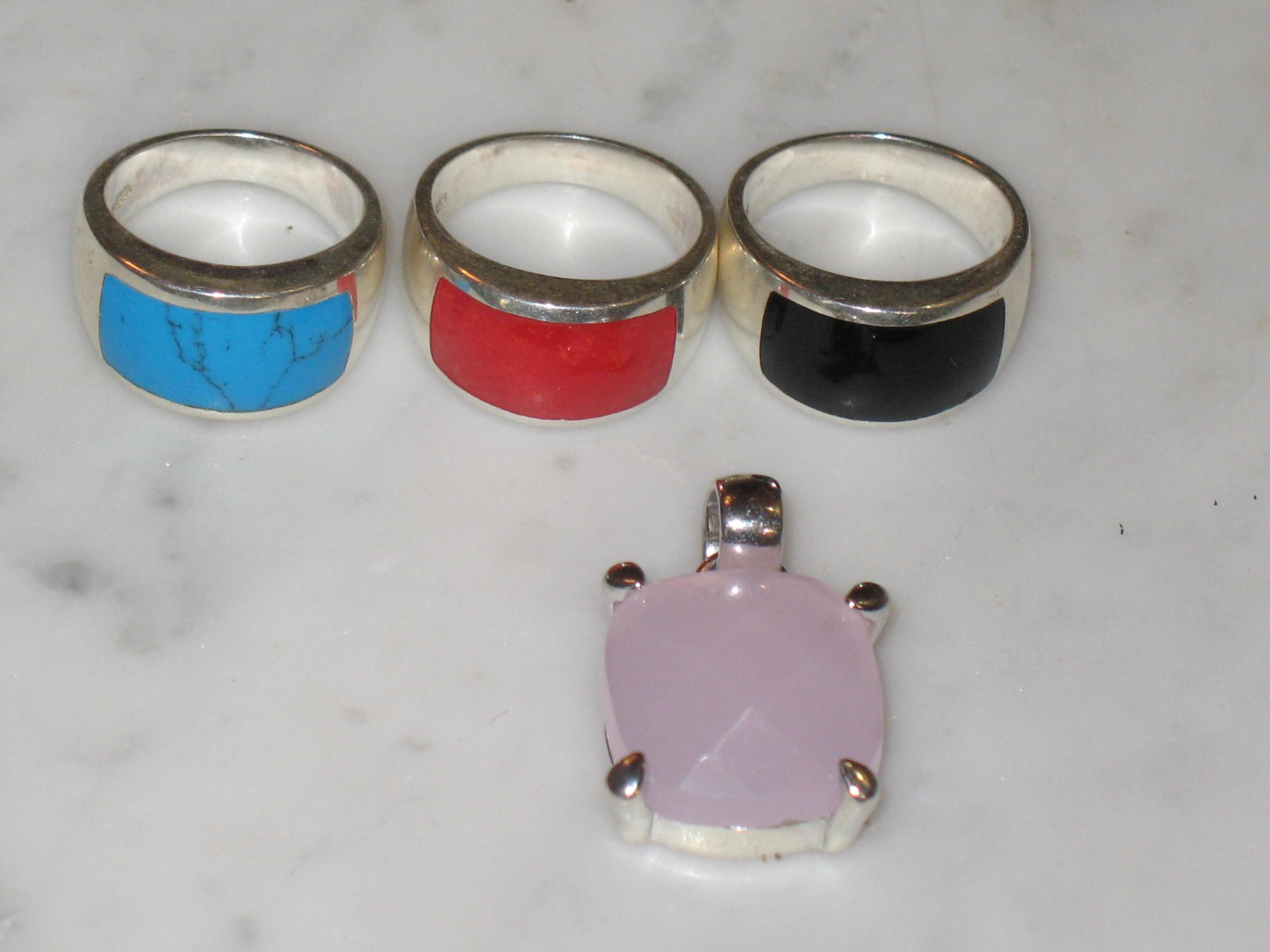 Колье серебро с бирюзой; браслет серебряный, техника "телькари" - плетение из серебряных перекрученных нитей; кулон из розового кварца в серебре; комплект колец из серебра с кораллом, бирюзой и ониксом.