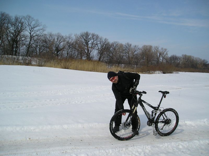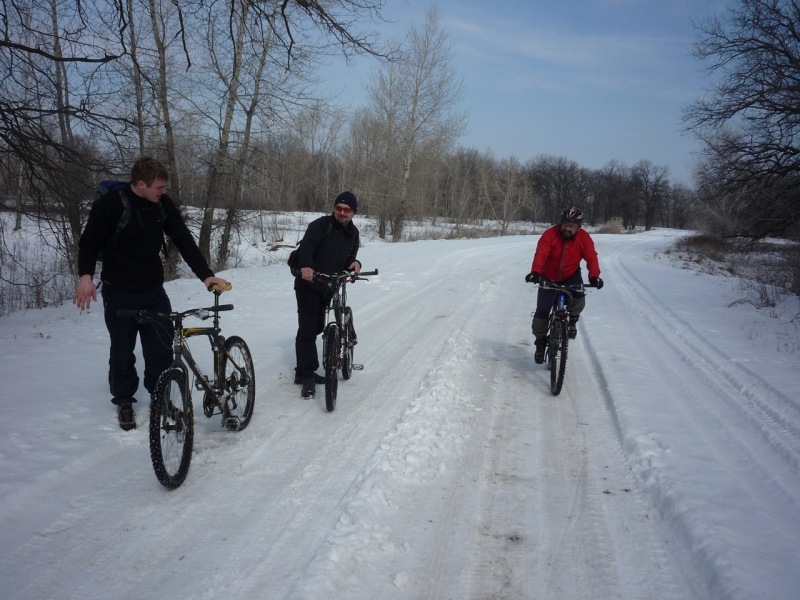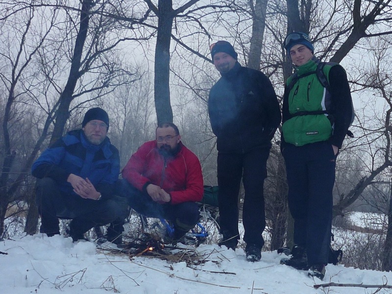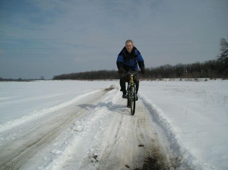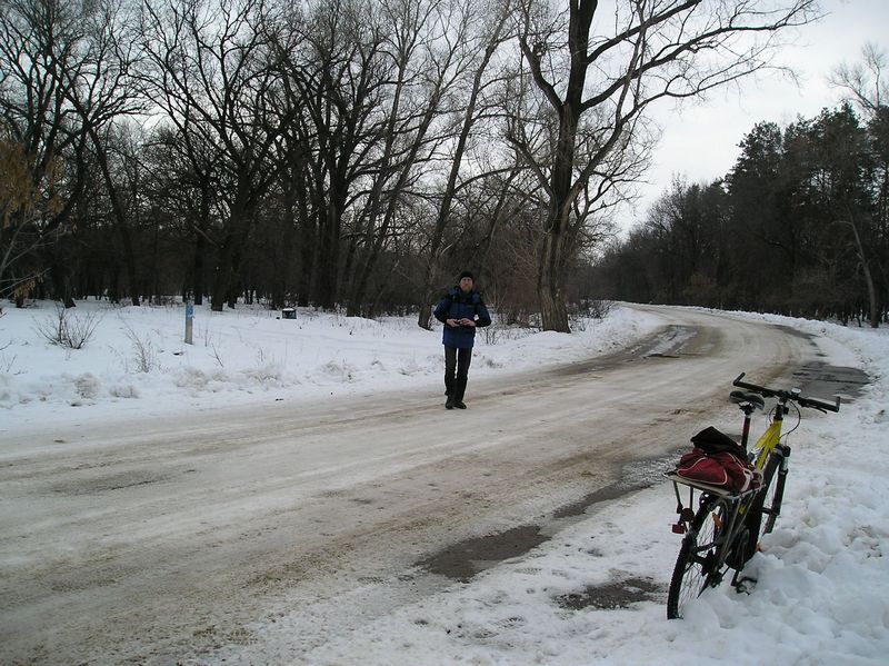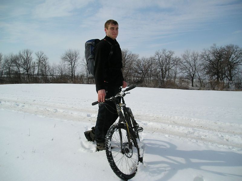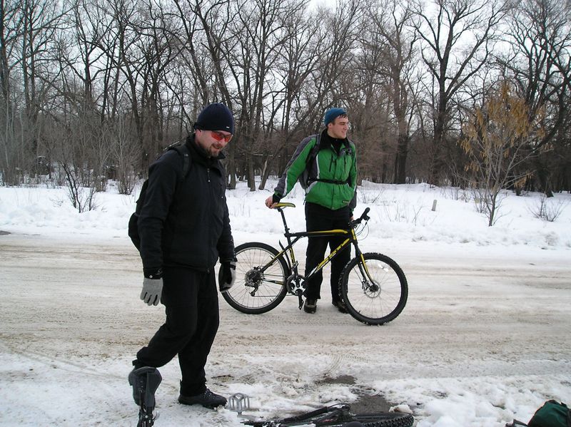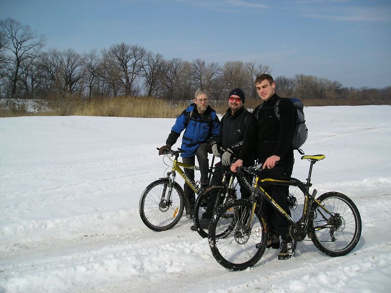 Последняя зимняя, она же первая весенняя, покатушка была вытянута усилиями PSV. Он настолько засиделся, что готов был ехать почти несмотря ни на что. Синоптики на субботу угрожали нам небесными карами - пасмурно, мол, будет, небольшие, мол, осадки весь день, да и ветер ажно 7 м/сек... Вроде как и нельзя ехать. Но если нельзя, но очень хочется, то - можно. Мне-то проще, я, считай, каждый день езжу. А вот PSV выехать хотелось очень. Забегая вперед, скажу: когда в двенадцатом часу выглянуло солнышко (мы в это время подъезжали к Ямам), я понял, что если бы с утра я и остался дома, то не усидел бы, увидев в окошко такую благодать. Да, с погодой нам повезло. Было солнышко, пусть не так уж долго, ветер был не только встречный, но порой и попутный, было тепло. Впрочем, хорошо ли, что было тепло - вопрос сложный... Итак, к 10:00 вся четверка была в сборе. Были PSV и tRIDENT, а ники еще двоих - по-моему, Shamano (Алексей) и Power CMW (Олег). Если я ошибся, приношу извинения. По мосту поехалось хорошо, так что, начав с умеренной скорости 23 км/ч, к концу моста мы раскатились до 28. Луж не было, был мокрый асфальт. Проехали мост, проехали пост ДПС, одолели подъем-тягунок и свернули к дамбе через Верблюд. Там нам встретился первый на нашем пути снег. Ночью, похоже, был небольшой минус, потому через дамбу мы проехали достаточно легко - укатанный снег еще как-то держал. А вот на подъеме за дамбой он уже начал расползаться под колесами, вел начало бросать - то одному, то другому приходилось периодически останавливаться, забурившись передним колесом в кашу. Дорога от пионерского лагеря до Среднеахтубинской трассы была примерно в таком же состоянии - приходилось ехать строго, избегая шевелить рулем. Перевалили через Среднеахтубинку и поехали к Сахарному. На вопрос "Сусанин, куда едем?" PSV глубокомысленно ответствовал: "А ... его знает...". Асфальт до Сахарного тоже был почти весь покрыт мокрой снежной коркой, которая норовила расползтись под колесом, но держать около 20 было нетрудно. Доехали до Сахарного и повернули направо, в поля. Дорога стала получше, снег еще держал - пока дорога шла по лесочку. А когда мы выехали на открытое место, где дорогу овевал ветерок, пришлось переключиться пониже и поработать как следует. За каждым из нас, как за пароходом остается кильватерный след, тянулась пробитая, продавленная, прорытая в плотном снегу канавка, выписывающая причудливые зигзаги. Будто пьяный ехал... Выехали на взгорок перед самыми Ямами и остановились передохнуть - взмокли. Появилась возможность оглядеться, которой мы тут же воспользовались. И восхитились - до чего же хорошо! Солнышко выглянуло, легкий ветерок, теплынь - и ощутимо пахнет весной. А под колесами - пусть усталый, ноздреватый и мокрый, но все же снег. Порог... Порог между уходящей зимой и накатывающейся весной. Поснимали шапки, кто-то снял лишнюю куртку, я и рукавицы снял. Знаете, очень непривычно было держаться за руль голыми руками, странно как-то... Мимо Ям пришлось ехать, по-прежнему притворяясь ледоколами. А солнышко-то пригревает, а теплый ветерок веет... как же нам дальше-то ехать придется? Недалеко за Ямами остановились на перекус с костерком. С хрустом и треском вломились в кусты, причем неугомонные Лёха и Олег в кусты нырнули, не слезая с велов. Нашли подходящую низинку среди деревьев, где ветра почти не было, развели костерок, перекусили, чем Бог пос