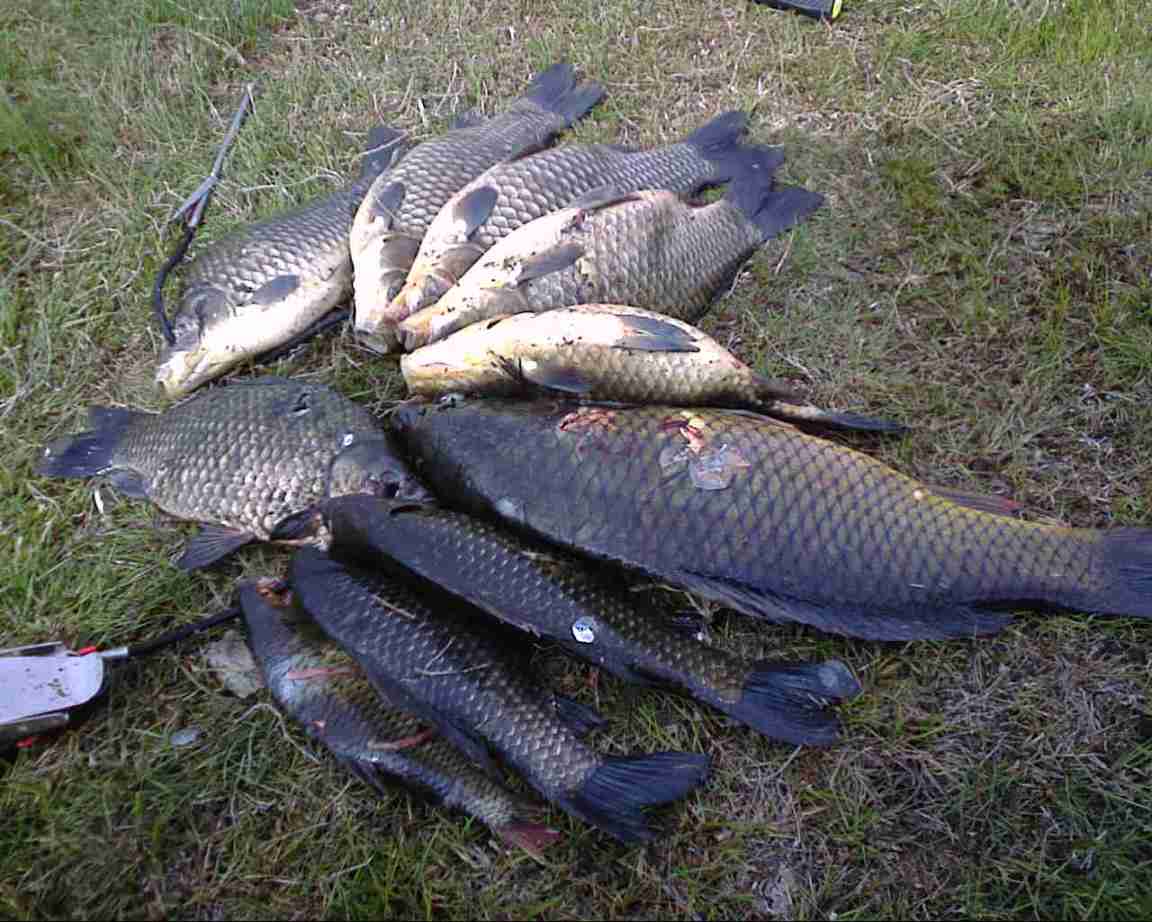 А это пару недель назад. Сазанчика на 8 кг коллега подстрелил, а мой улов на второй фотке (там тоже есть сазанчик, но гораздо скромнее - 2,5кг)