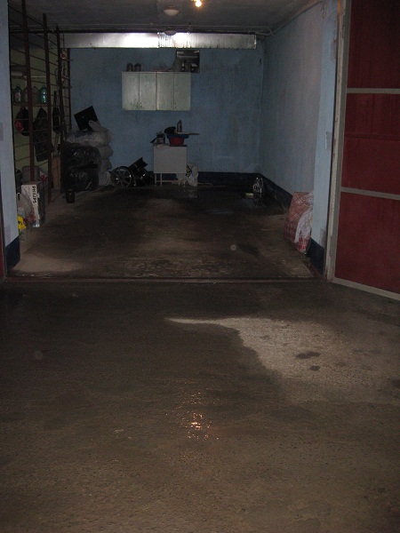 картинка ниже, 1 - общий вид, лужа перед воротами от воды вытекшей с гаража 2 - полы 3 - вход 4, 5 - потолок и задняя стенка с которой течет 6 - общий вид.