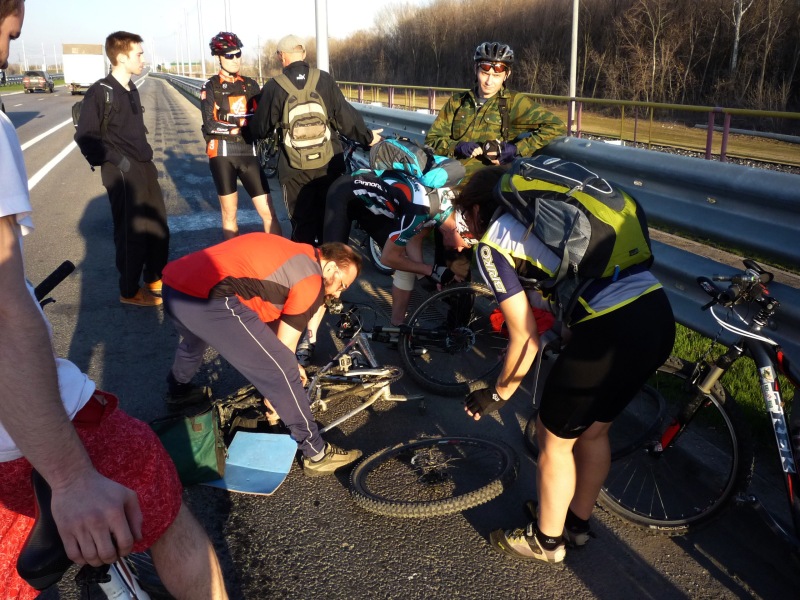 Мне понравился наш вчерашний рейд. Микропокатушка, включившая некоторые интересные элементы. У меня вчера с учётом дневного "вонюче-городского" пробега вышло чуть больше 60-ти километров, преимущественно в бодром темпе. По грунтовке катили шустренько и с удовольствием. А как замечательно было в темноте, при свете фонарей, да на свежем воздухе! Многие понахватали колючек в колёса, были и серьёзные поломки. Я, даже идя пешком, умудрился влезть своим велом в немногие лужи, хорошенько угваздаться и песочка нахватал в тапки и сам прокололся. А потом были и закономерные посиделки на набережной, домой я приехал что-то около часа, подуставший, голодный и довольный. По моему мнению, тренировочная покатушка прошла на весьма позитивной волне, я остался доволен
