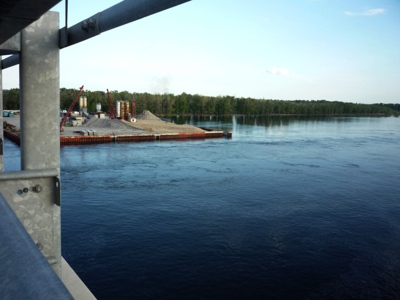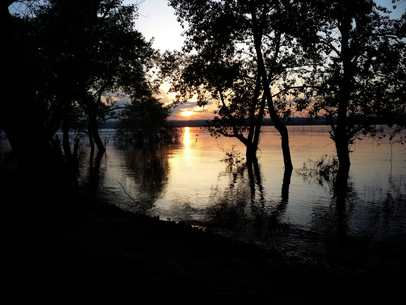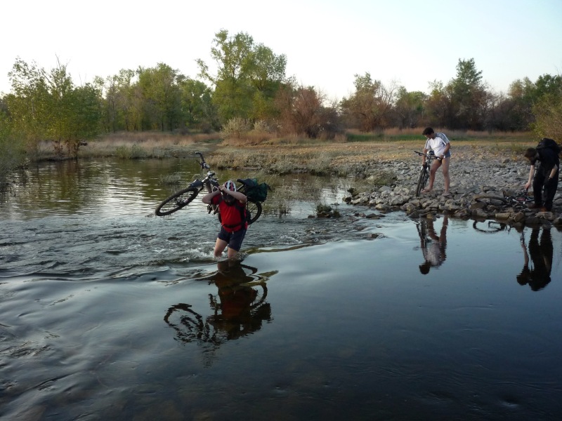 Покатушка состоялась. И если кто-то не поехал потому, что поленился, то - зря. Было здорово. Стартовали мы от Европы в 18:35. По мосту ехали в темпе, начали с 23 км/ч, к концу моста раскатились до 28. По среднеахтубинской трассе проехали от заправки километра полтора-два и ушли влево, к Верблюду. Вода в нем упала сантиметров на 70 по сравнению с 9 мая, и тот участок дороги, что во вторник едва освободился от воды, сегодня был почти сухим. Вдоль Верблюда по грунтовкам мы доехали до Старенького, держа 18-24 км/ч. Железный мостик, что в овражке за Стареньким, оказался не только сухим, но был сантиметров на 30 выше воды. Я думал, там проехать не удастся. В паре мест за мостиком, по пути к Волге, на дороге была грязь, но мы легко объехали ее по траве. В основном дорога была в отличном состоянии, сухая и ровная - приятно ехать. Вскоре мы выехали на вал, огораживающий рыборазводные чеки, и по нему доехали до Волги. Часть вала усыпана крупным щебнем, пришлось попрыгать. Возле Волги мы поразмыслили, ехать ли сразу к верхней дамбе Верблюда, или сначала глянуть, что творится в устье Верблюда. Решили глянуть. Через 10 минут увидели дорогу, ныряющую в воду, и повернули к верхней дамбе. Издалека дамба выглядела сухой... но только издалека. Когда мы подъехали поближе, то увидели, что паводком размыло насыпь из крупных камней, ведущую к бетону, и вода шурует из Верблюда в Волгу, отрезая нас от бетона. И хорошо шурует! А нам надо на бетон... Вода была не особо холодная и прозрачная, слив гладкий, и камни были хорошо видны. Да и глубина - чуть больше чем по колено... но гряда камней была узенькая, а камни под ногами качались и были острыми. Вот только все это я выяснил позже, а сначала отнесся к броду несерьезно - и едва не поплатился за это. Я недооценил напор и глубину воды, и вместо того, чтобы поднять вел как можно выше, взял его одной рукой за нижнее перо задней вилки. Колеса оказались при этом опасно близко к воде. Мне помогло то, что раньше я ходил через горные речки и точно знал: спешить, делать резкие движения и разуваться нельзя. Потому, когда камень ушел из-под ноги, я плавно отклонился в сторону, восстанавливая равновесие, и хотя колеса вела на треть ушли в воду, это произошло медленно. Сразу же стало трудней стоять, колеса здорово парусили. Поток начал стаскивать меня с каменной гряды на глубину. Если бы колеса окунулись резко, я бы не устоял. А так я поймал равновесие, плавно поднял вел, вытащив колеса из воды, как следует присмотрелся, куда поставить ногу, и медленно сделал шаг, потом другой... Еще два раза колеса окунались в воду, еще два раза я ловил равновесие - и оба раза поймал. Думаю, будь я босиком - поймать не удалось бы. И только когда я выбрался на бетон, спохватился - мобильник и фотоаппарат лежали в моей поясной сумочке, а я про это даже не подумал! Пока я доставал фотоаппарат и включал его, мимо меня попытался проплыть башмак Wide. Мне удалось его поймать - возле моего берега течение было потише. Потом народ по одному переправился, и все прошло в целом благополучно. Наши потери - Wide шел босиком, потерял равновесие и намочил часы, которые тут же отключились, да уплыл один из моих шлепанцев - мы какое-то время видели его, но там было, пожалуй, уже по грудь. И мы решили отпустить его с миром - может, до Астрахани доплывет? А то и до Каспия... Дальше мы свернули от дамбы вправо, к Волге, и вскоре на 