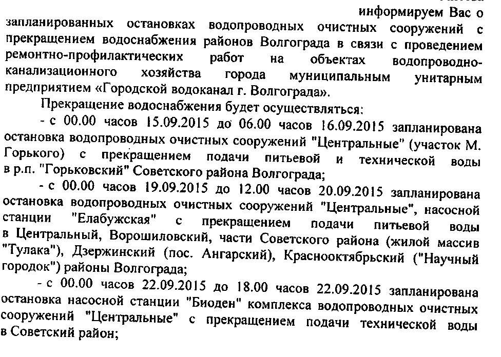Горводоканал Волгограда в ближайшие выходные проводит последнюю в летнем сезоне плановую остановку водоснабжения в городе. Как сообщили ИА "Высота 102" в пресс-службе предприятия, с 00.00 16 мая до 12.00 17 мая будут остановлены ВОС "Центральные" и насосная станция "Елабужская". На это время будет прекращена подача питьевой воды в Центральный, Ворошиловский, часть Советского района (жилая застройка Тулака), Дзержинский (пос. Ангарский), Краснооктябрьский ("Научный городок") районы Волгограда.