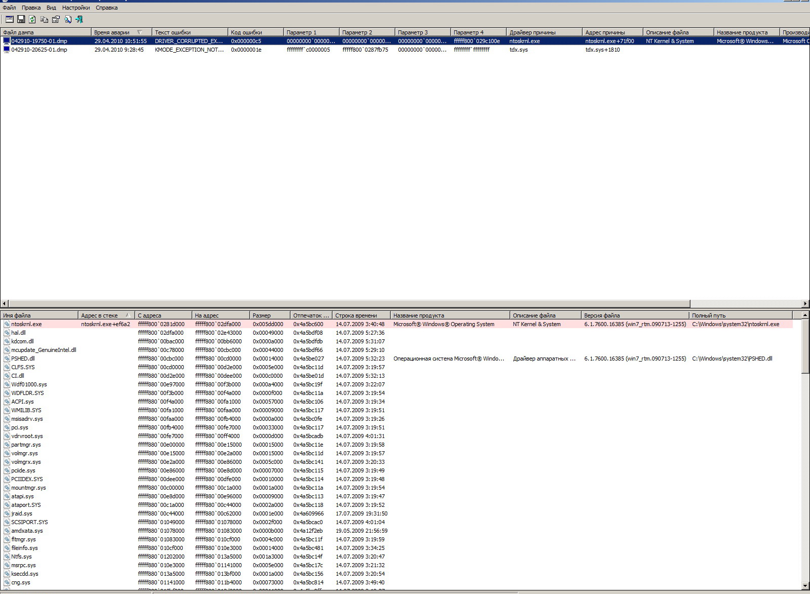 Стояла у меня win 7 х86 и 4гб памяти, было 2 винта на 250 и 500гб купил винт на 1Тб, поставил его начал инфу скидывать с тех... вот как поставил в ходе работы было пару раз что выскакивал синий жкран смерти, ну я решил переставить наконец винду до win 7 64 bit поставил, проработала она 4 дня и вот сегодня снова началось, пока спал 2 раза Bsod вылетел... Помогите разобраться в чем дело может быть...думаю чтото с винтом дружить не хочет у меня, заранее спасибо о системе: asrock P55 extrim+s1156 3500, видео хт1600про, разогнано в биосе немного но эт давно и все стабильно работало... з.ы. скрины прилагаю...