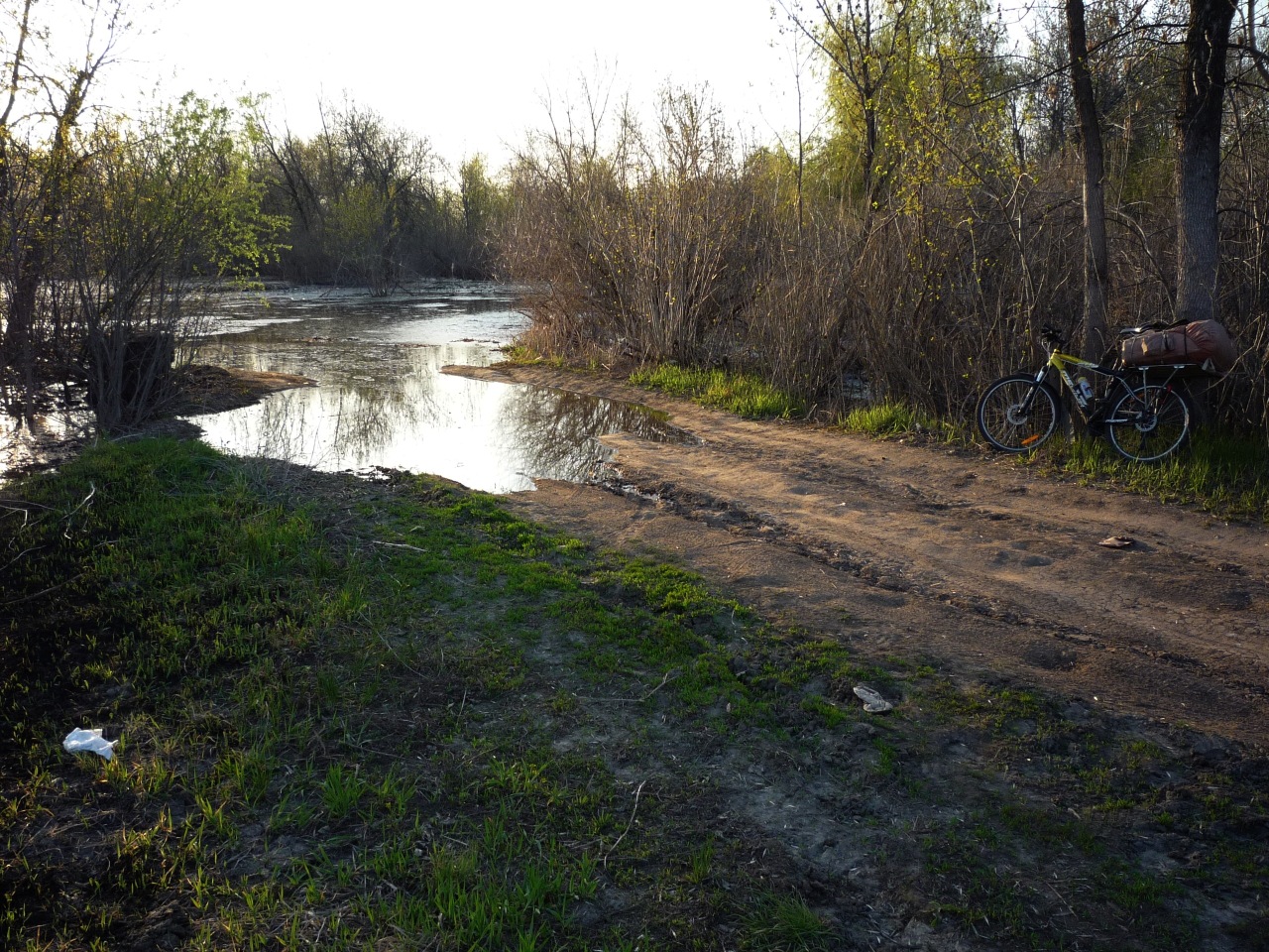 Из дома мы с женой выехали в районе 16 часов 1 мая. Для нее этот выезд - первый в этом году, и мы решили ограничиться тридцатью километрами. Ехали через Сахарный на Нижние Ямы и дальше - на Грязный затон. По пути туда я все ожидал, что одна из низин будет залита, но до Ям мы доехали посуху. Правда, дамба, ведущая в Нижние Ямы, была всего сантиметров на 15 выше уровня воды. Доехали нормально, если не считать прокола двух колес у нее и двух у меня. Неосторожно съехали с дороги... Проехать к самому Грязному затону мы не смогли - в одной особенно глубокой балочке уже была вода. Немного, можно было и перебраться, но ведь возвращаться-то завтра как-то надо? А завтра будет уже не немного. Потому встали на низинке, идущей параллельно Грязному затону и уже превратившейся в ерик. Через час подъехала машина, мужики накачали лодку и поехали ставить сети. Дневальный, занятый костром, явился к нам и попросил клок газеты - разжечь костер. Костер я им разжег горелкой. Потом вернулись лодочники, открыли закрома... Когда, уже около часа ночи, мы ложились спать, гулянка у их костра, метрах в 40 от нашего, была в разгаре. Но не вопили, не дрались и к нам больше не приходили. Разве что около четырех утра двое протащили рядом с нашей палаткой сухое дерево, громко топая, хрустя и нецензурно что-то обсуждая. С утра состоялся ремонт колес. В колесах своей половинки я просто поменял камеры, чтобы не клеить латки - я теперь понял, что герметик ей в камеры залить все же надо, мне же будет меньше хлопот. А приклеенные латки от герметика отваливаются. Из своего переднего колеса я вынул старого доброго "ёжика", и герметик с блеском залатал дырку. А вот с задним вышло хуже. Я извлек из него две тааааких колючки... куда там ёжикам! Такие колючки бывают на ветках. Длиной эти жуткие звери были по два сантиметра, а диаметром в основании - заметно толще спицы. Герметик и тут справился... почти. Если после извлечения этой жути колесо спустило за 15 секуню, то после двух подкачиваний оно спускало за 15 минут... но - спускало. А переднее залаталось сразу. Может быть, мне не повезло в том, что дырка в покрышке затянулась раньше дырки в камере? Я снял колесо, отнес его к воде и проверил методом погружения. Через покрышку - ни пузырька, а выходил воздух рядом с вентилем. Когда я разобрал колесо, выяснилось, что возле вентиля камера в порядке, а сочится воздух через прокол от колючки, но поскольку прямого хода наружу ему нет, т. к. дырка в покрышке уже затянута, воздух просачивался между покрышкой и камерой и выходил возле вентиля. И, похоже, просачивался он слишком медленно. По моим наблюдениям, герметик полимеризуется, когда пузырится и бурлит. А тут было не пузырение, а слааабенькое просачивание, и я думаю, этого для полимеризации не хватило. Очень может быть, что если бы я подкачал колесо еще раза три, дырка бы и затянулась, но запасная камера у меня была, а качать по жаре было лень. Возвращаясь через Нижние Ямы, мы уткнулись в поток на месте вчерашней дамбы. Повернулись и, солнцем палимы, поехали в Верхние Ямы, через которые проходит грейдер Фрунзе - Тумак. Вообще-то в Верхних Ямах есть еще одна дамба, и проехать на Сахарный можно было бы через нее. Но в селе нам подсказали, что по дамбе из Ям выехать еще можно, а вот удастся ли доехать до Сахарного - бааальшой вопрос... по пути ведь и другие низины есть. И мы решили, не искушая с