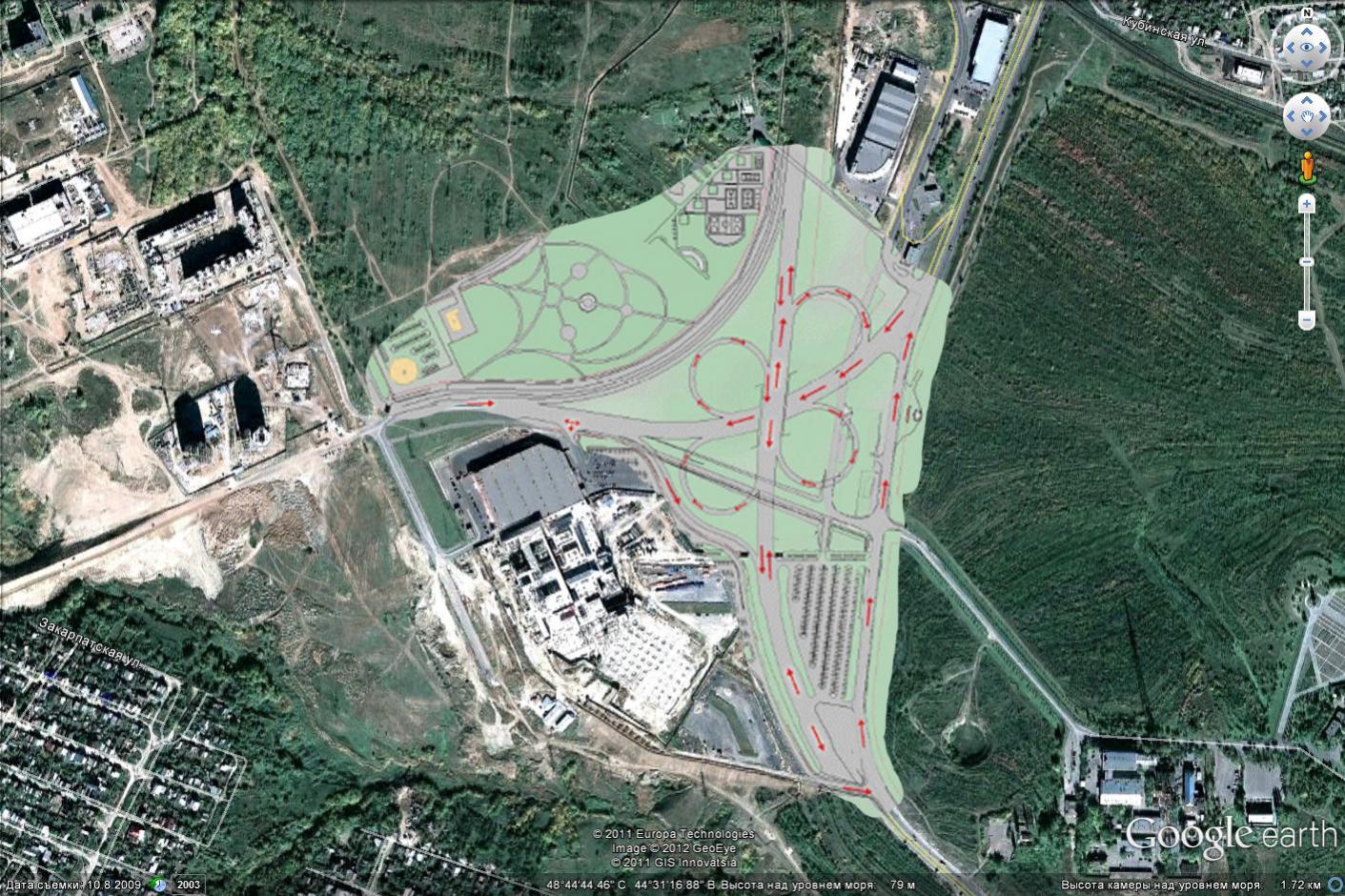 А вот так этот проект вписывается в существующие строения на этом участке: Как видно, планируется дублер ул.Землячки за автосалонами, их владельцам можно не волноваться