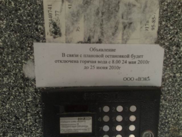 За неделю на подъезде появилось предупредительное объявление, что в связи с плановым обслуживанием трубопровода возможны перебои с горячим водоснабжением 25 и 26 мая.