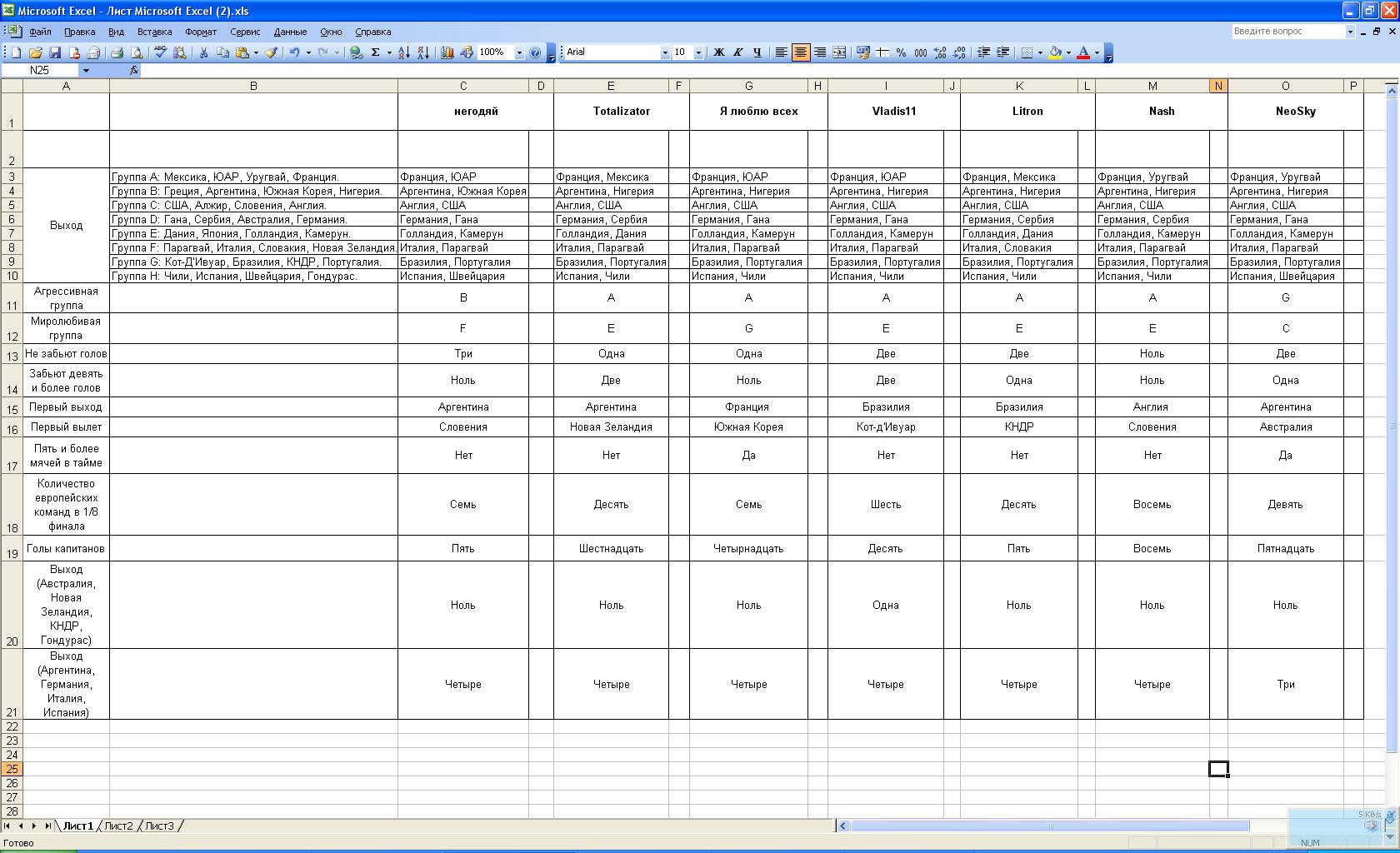 Первая часть (финальная стадия). 1. Чемпион Мира. Аргентина. 2. Четвёрка полуфиналистов. Бразилия, Франция, Нигерия, Германия. 3. Лучший бомбардир первенства. Лионель Месси (Аргентина). Вторая часть (групповая стадия). 1. Две команды, которые выйдут в следующую стадию из каждой группы. 1. Группа А: ЮАР, Франция. Группа B: Аргентина, Нигерия. Группа C: США, Англия. Группа D: Гана, Германия. Группа E: Голландия, Камерун. Группа F: Парагвай, Италия Группа G: Бразилия, Португалия. Группа H: Чили, Испания. 2.Самая агрессивная группа - А. 3.Самая миролюбивая группа - Е. 4. Две команды не забьют мячей на чемпионате. 5. Две команды забьют девять и более мячей на групповой стадии. 6. Первая команда, гарантирующая выход в 1/8 финала – Бразилия 7. Первая команда, потерявшая даже теоретические шансы на продолжение борьбы – Кот-д’Ивуар 8. Ни в одном тайме любого матча не будет забито 5 и более мячей. 9. Шесть европейских команд пройдут в игры на выбывание. 10. Десять голов забьют капитаны своих команд на групповой стадии. 11. Из четвёрки команд (Австралия, Новая Зеландия, КНДР, Гондурас) одна выйдет в 1/8 финала. 12. Из четвёрки команд (Аргентина, Германия, Италия, Испания) в 1/8 финала выйдут все.