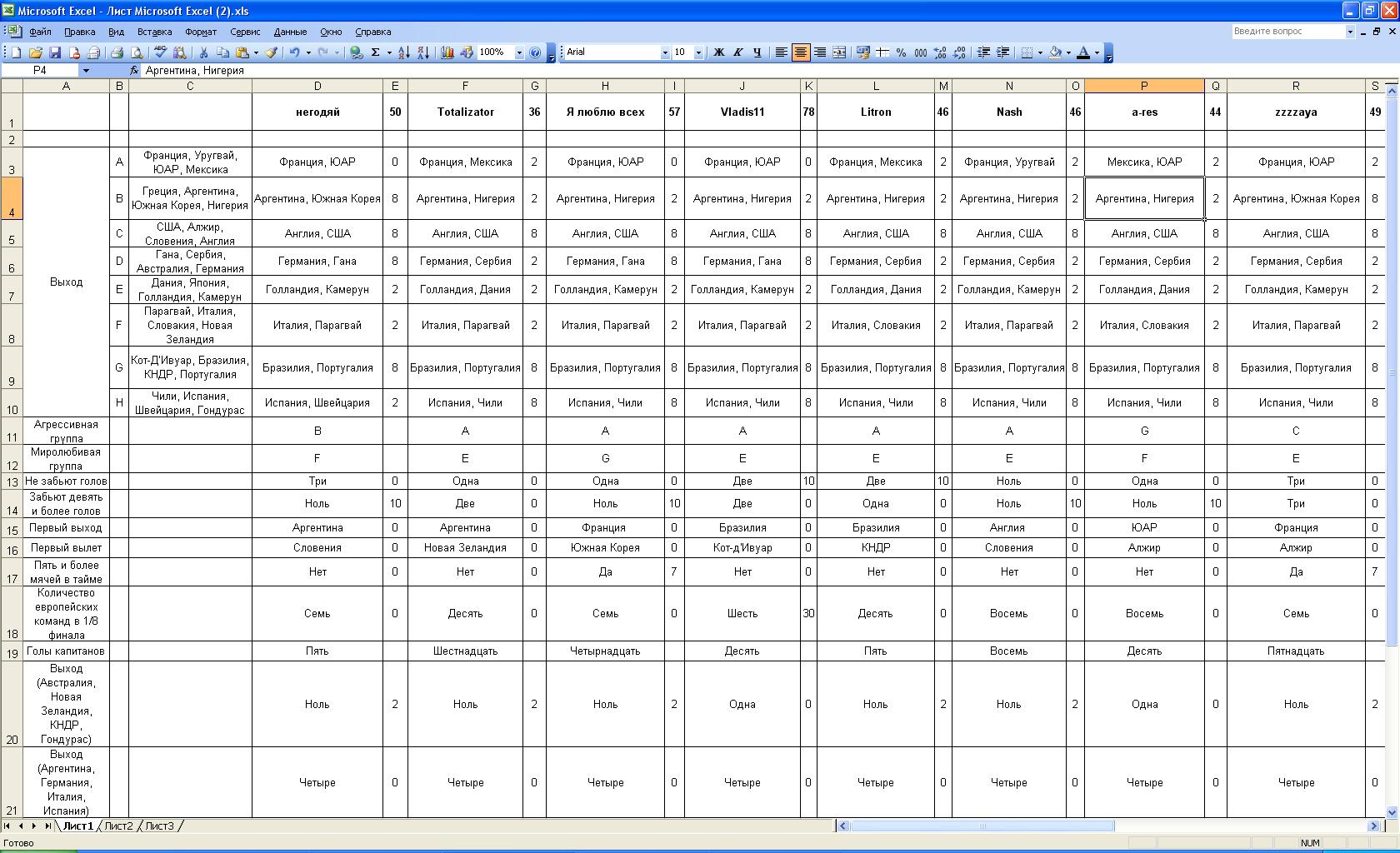 Kotel34, спасибо тебе огромное. Вечером подкорректирую. FAQ, нет. Только на групповой стадии. Если останусь жив, то вечером дам окончательные итоги группового этапа.