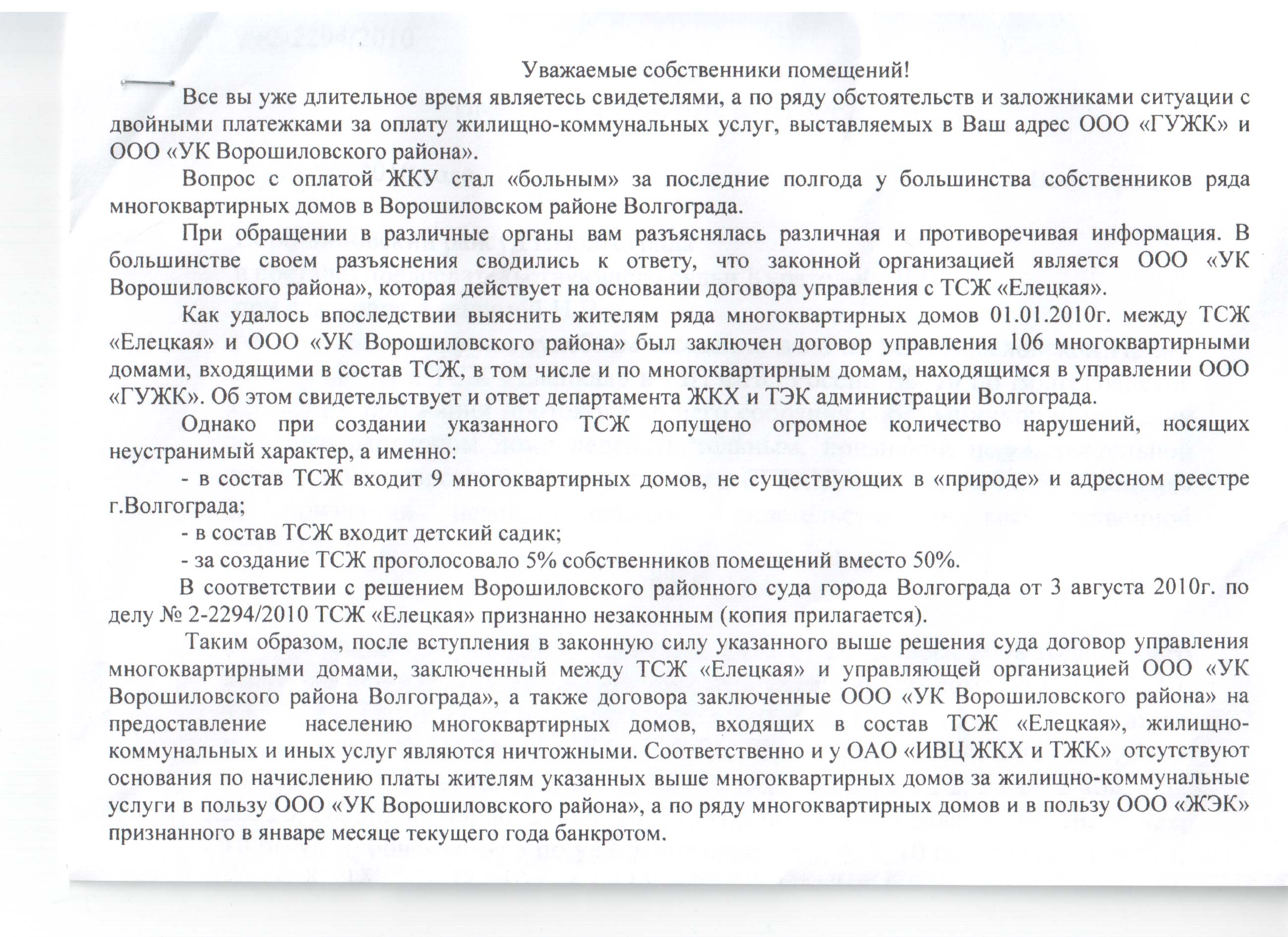 Сегодня пришла ксива от ГУЖК. По которой РЕШЕНИЕМ СУДА отменено ТСЖ "Елецкая" и соответстсвенно все их договоры с УК "Ворошиловского района". Прикольно - решение суда против решения департамента ЖКХ. Кто прав кто нет - сам черт не разберет. А скорее всего обе УК собирают деньги незаконно.