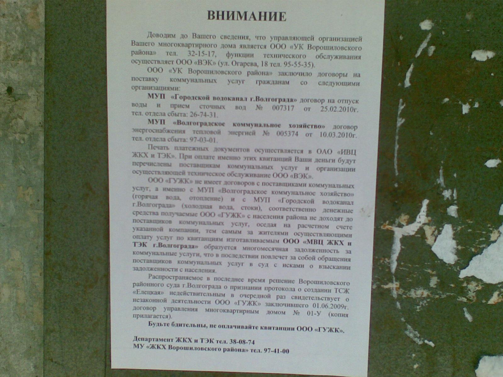 2-1 В пользу OOO УК "Ворошиловского района". Расклеили сегодня на дверях подьезда: Причем каждая УК не доказывает свою легитимность, а доказывает мошенничество конкурента. Причем успешно.