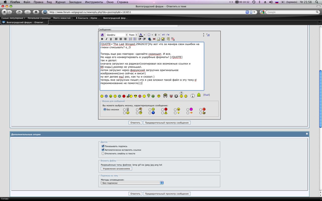 так и делал: сначала загрузил на радикал(скопировал все возможные ссылки и бб-коды),размер не уменьшал. потом загрузил через форумский загрузчик оригинальное изображение(оно сейчас и висит) ну вот делаю ещ] раз, как ты и сказал теперь мне загрузчик пишет,что я уже вложил такой файл в эту тему переименование не помогло)))