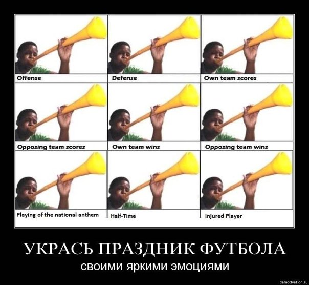 По поводу вувузел. На днях блоггер drugoi запустил утку про начало производства этих штучек в России. Наши славные СМИ дружно подхватили "новость", даже не проверив достоверность информации. Вроде и на общероссийском канале эта утка имела место. http://drugoi.livejournal.com/3290434.html