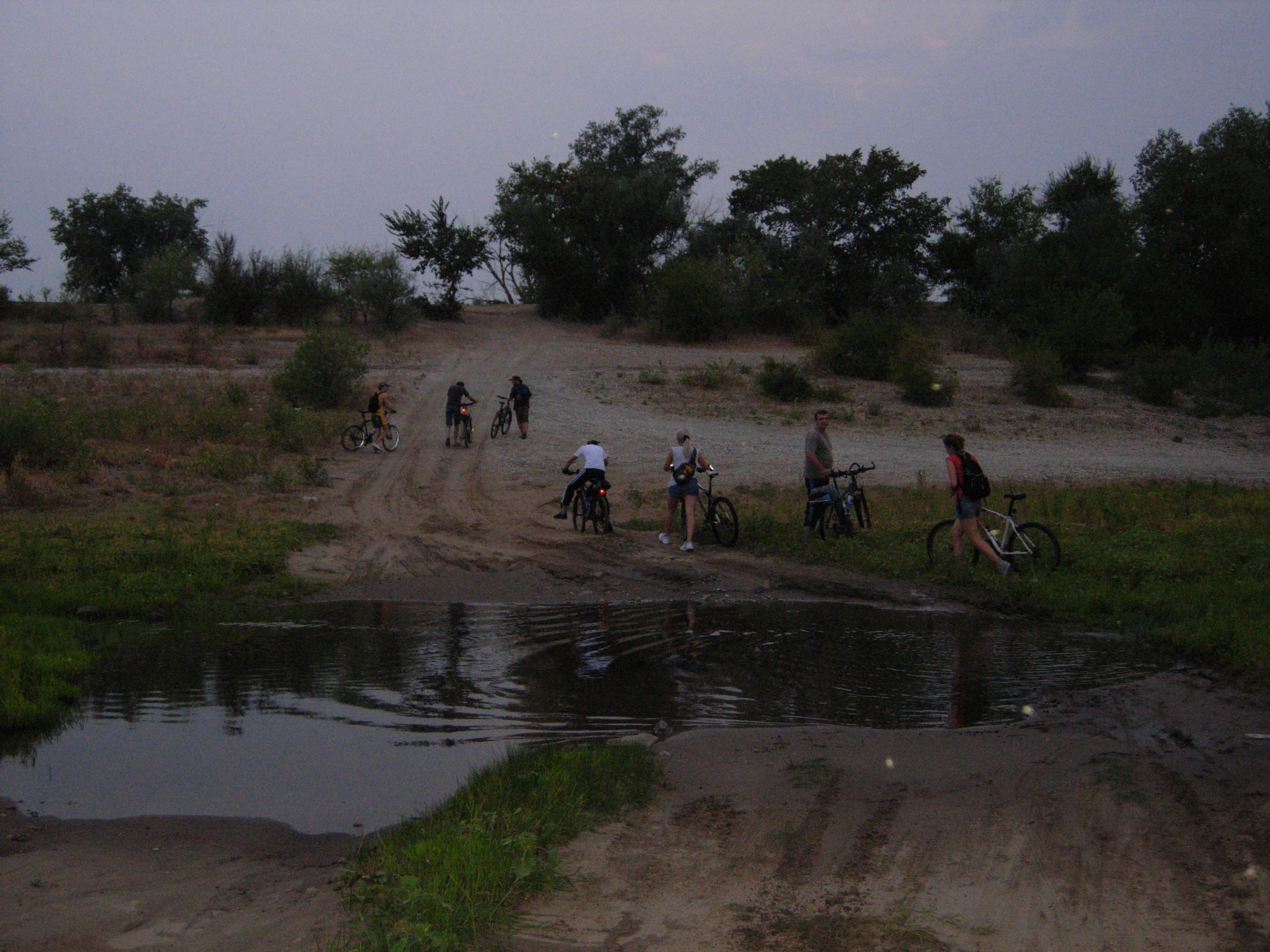 Вчера в 19:00 у Европы собралось просто небывалая толпа - 17, по-моему, человек. Образовалось 2 группы - одна поехала на тренировку в сторону Тумака, их было пятеро, вторая - 12 человек, - поехала на легкую прогулку. Как съездили спортсмены, не знаю - они планировали пробег 50-60 км. Отдыхающие переправились через Верблюд по нижней дамбе и поехали на Старенький. Доехав до Волги, посовещались - останавливаться на камнях или ехать до песчаного пляжа у т/б Волга. Решили ехать на пляж. Приехали уже в сумерках, поставили кипятиться чай, а сами полезли купаться. Когда чай заварился, уже ощутимо стемнело и налетели комары. Чай пришлось пить, приплясывая. Потом был ремонт колеса - один из нас поймал колючку. А когда ремонт закончился, комаров почему-то стало заметно меньше. Обратно ехали через Вишневую улицу, что в дачном массиве Верблюда. Дорога от Волги до дач Денежного озера тоже становится все более песчаной. Надеюсь, обещанные вскоре дожди это исправят. Потом было традиционное фото под фонарем предмостной эстакады и разъезд по домам - кто быстрей, кто медленней... Пробег по пойме составил 28 км. На дорогах довольно много песчаных участков, но непроезжих - почти нет.