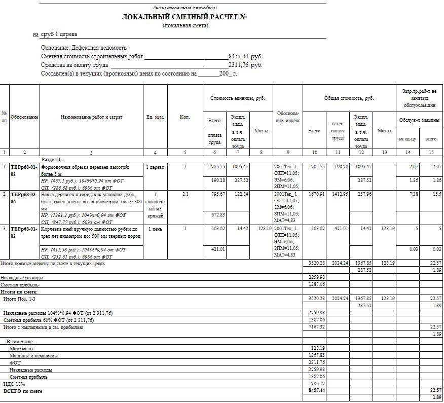 Вот приблизительно смета на сруб одного дерева без погрузки веток и перевозки. Объем кряжей взял из сообщения Parabellka, но их можно написать намного больше, это фиг проверишь.