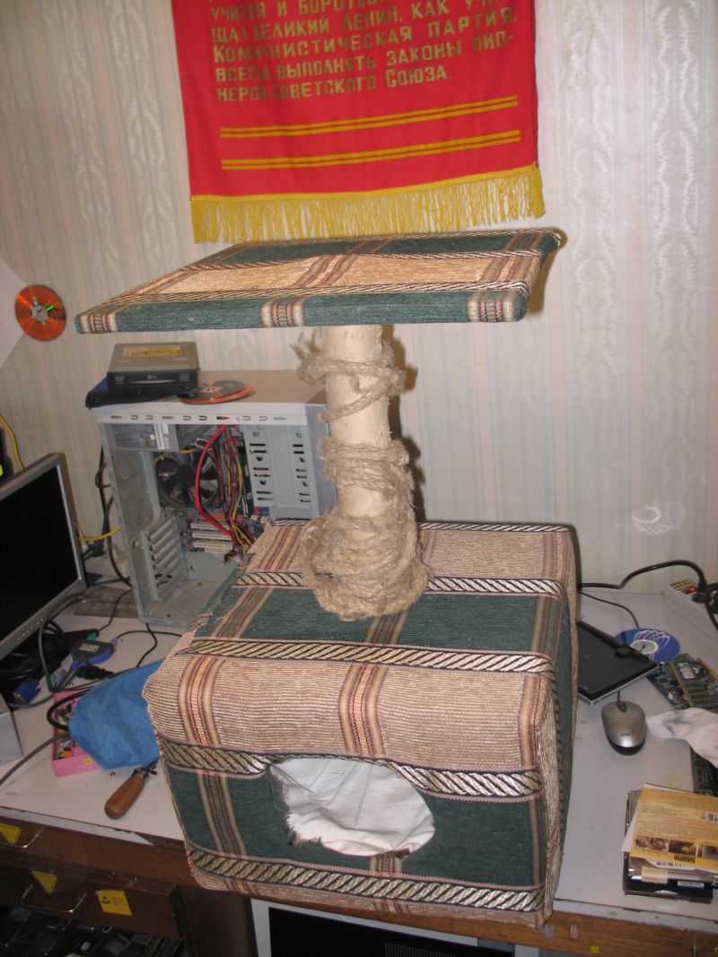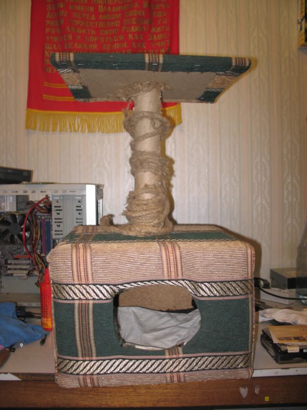 Продается уютный домик для котика с обзорно-вертолетной площадкой, стоящей на колонне для обточки коготков. Строительный материал: ДСП, такнь для обивки диванов. Аукцион от 100 руб. 8-906-400-16-03