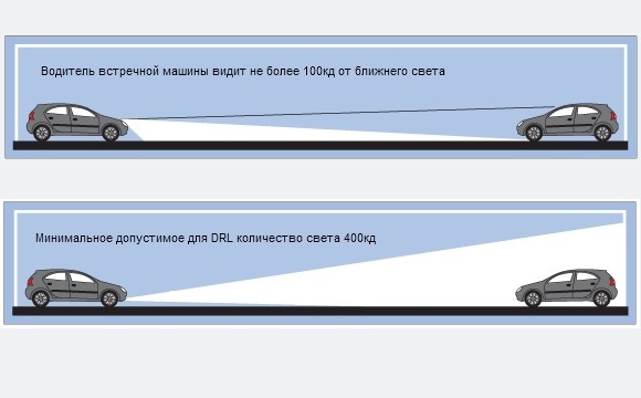 Нормальная реализация DRL предусматривает отключение оных при включении ближнего. Ибо дневные огни светят вверх, а не вниз как основной свет. http://www.hella-russia.ru/Drivers/Tuning/DayLights/LEDayFlex.shtml Картинка оттуда: http://www.hella-russia.ru/img9/LEDayFlex-2.jpg вверху ближний свет, внизу дневной.