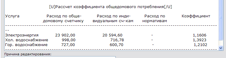 Zazell, ломОтно. Примерно так: Рассчет коэффициента общедомового потребления Услуга Расход по обще- Расход по инди- Расход по Коэффициент домовому счетчику видуальным сч-кам нормативам ------------------------------------------------------------------------------------------------------ Электроэнергия 23 902,00 20 594,60 - 1,1606 Хол. водоснабжение 998,00 716,78 - 1,3923 Гор. водоснабжение 727,00 600,70 - 1,2102 ------------------------------------------------------------------------------------------------------- Тьфу, блин...... Щас.