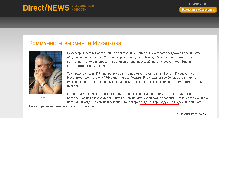 http://www.directadvert.ru/news/txt/?id=8461&nnn_id=15064493 "Режиссёр Никита Михалков написал собственный манифест, в котором предложил России новую общественную идеологию. По мнению режиссёра, российскому обществу следует отказаться от капиталистического прогресса и вернуться в лоно "просвещённого консерватизма". Мнения комментаторов разделились. Так, представители КПРФ попросту смеялись над михалковским манифестом. По словам Ивана Мельникова, депутата от КПРФ, вице-спикера Госдумы РФ, Михалков всё больше отдаляется от художественной стези, всё больше внедряясь в общественную жизнь, однако и там, и там он терпит провалы. По словам Мельникова, близкий к политике режиссёр намерен создать угодное ему общество, разделённое по классовому принципу, причём придать своей семье дворянский статус, чтобы он и его потомки никогда ни в чём не нуждались. Как заверил вице-спикер Госдуры РФ, в действительности России крайне необходим прогресс и развитие. "