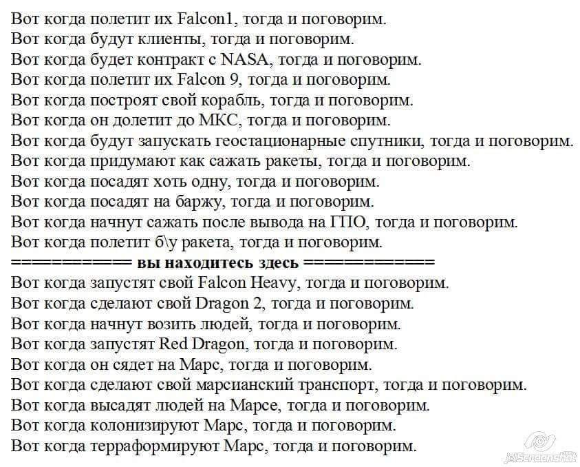 Включение на 40 рабочих циклов + самый лучший по тяговооруженности. Весьма неплохой двигатель. Пруф aviationweek.com/blog/nasa-cnes-warn-spacex-challenges-flying-reusable-falcon-9-rocket?sfvc4enews=42&cl=article_4 Маск не выводил компанию на IPO именно для проекта достижения Марса. Для NASA и инвесторов там все прозрачно и хорошо. Маск даже ставил в известность когда выводил от туда часть средств на другие проекты. Двигатели остались прежние, сама "труба" также, но они признались что в первый раз "побоялись" и заменили, все что можно заменить. Денежки поступают и без многоразовости, у них манифест на годы вперед расписан https://www.reddit.com/r/spacex/wiki/launches/manifest На второй есть. И я не видел в главных Российских СМИ тоже на первых страницах новости про SpaceX. Вот Рогозин с Песковым поздравили их - это да. Конечно же будет ссылка на "пруф".