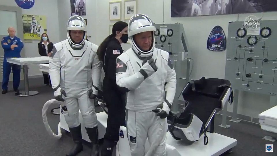Также как в российских. Воздухообменом через переносной контейнер-чемоданчик до посадки в корабль и от СЖО корабля, после посадки. Клапан на правой ноге. Вон у Боба шланг подсоединен, а Behnken отцепил штуцер и держит его в руке. Потом он попросил бабу из обслуги принести замену его чемодану. Она сгоняла, принесла новый.