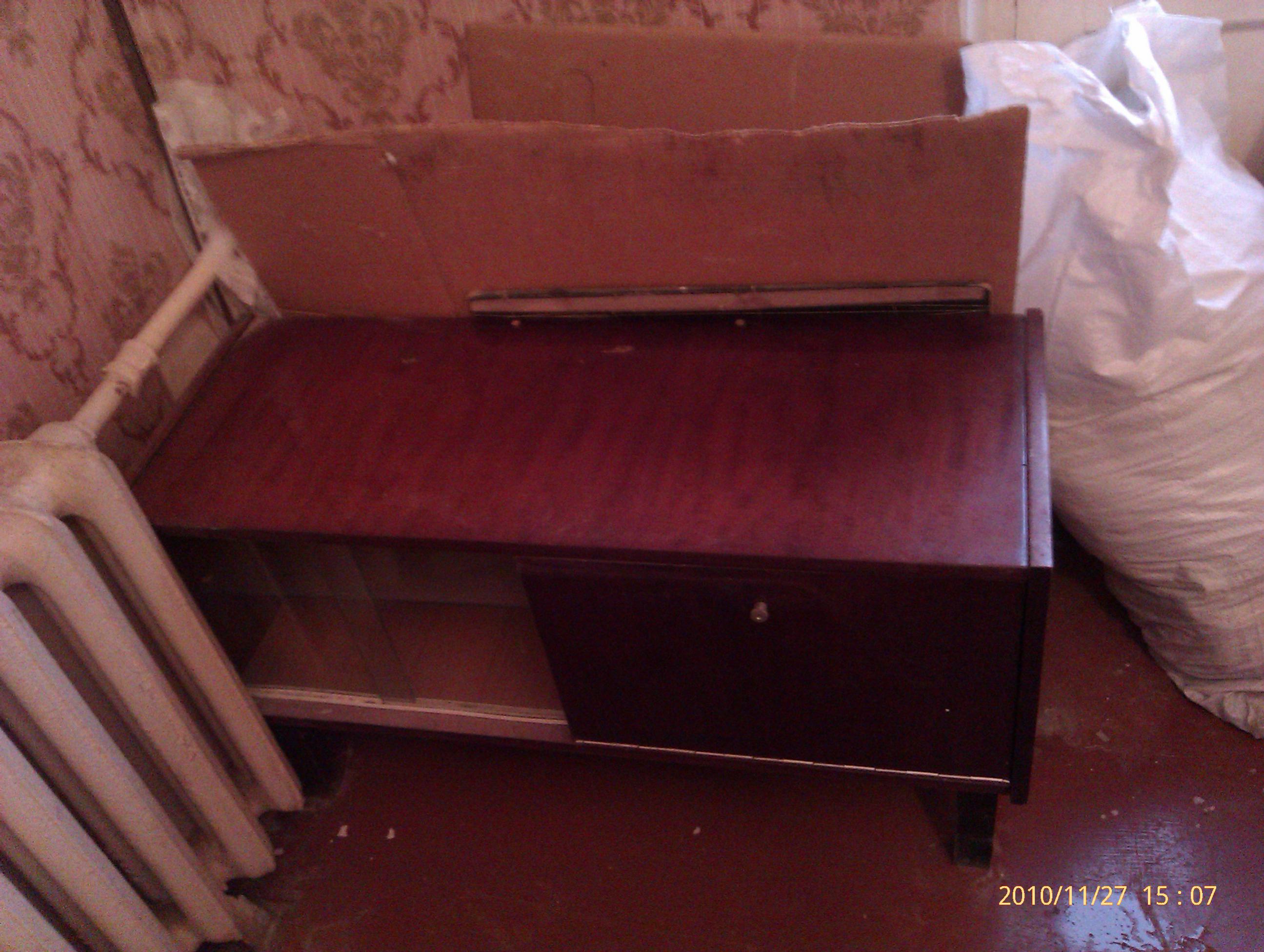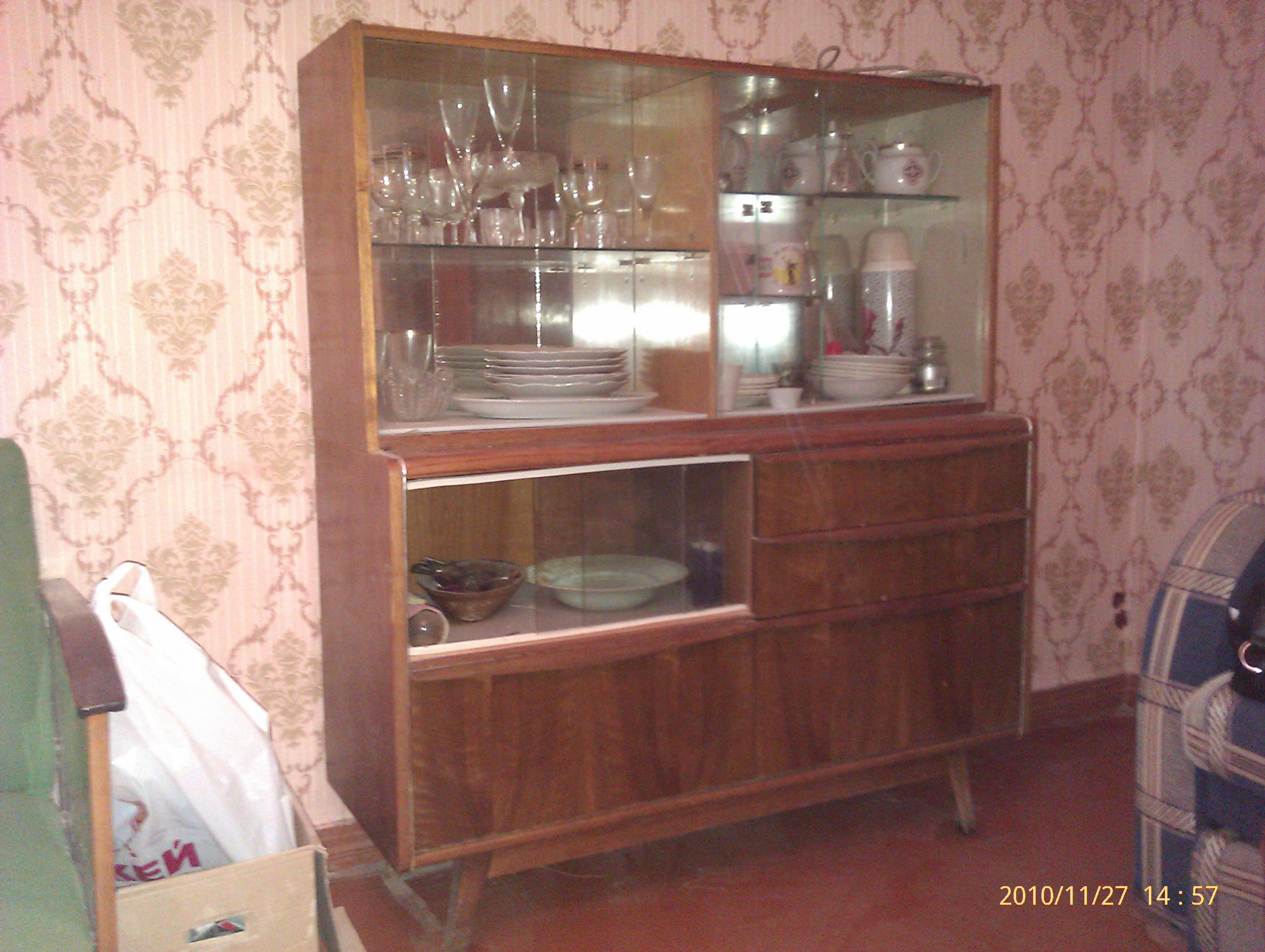 На настоящий момент еще ждут своего хозяина: сервант, шкаф для одежды, 2 тумбочки (1 на фото 9-10, другая - большая - под проигрывателем была), кухонный стол и кухонный же шкафчик-пенал. Есть еще круглый стол, который раздвигается в овальный, но он за деньги. Подробности в личке.