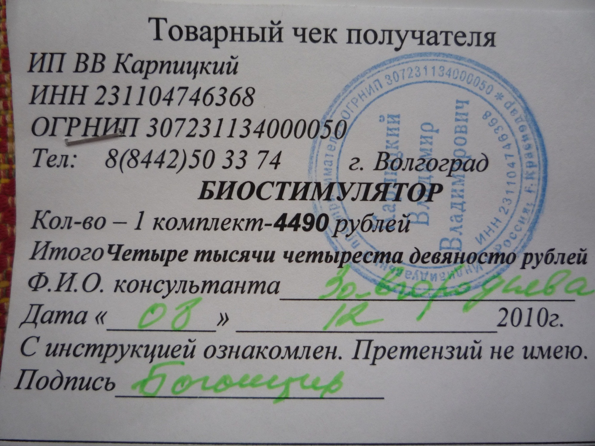 Наш дедушка живет в Городище, ему 85 лет, он ветеран, навещаем его регулярно, продукты привозим и тп.. но живет он один, проблем никогда не было, дверь никому не открывал чужому.. а тут 2 месяца назад к нему пришли 2 мужчин и женщина и впарили ему какую-то таблетку за 4490 т.р., приходили они всего 3 раза и в результате он у них этих таблеток на 36000 набрал...:( как такое могло случиться - не понимаем сами.. гипнотизировали они его чтоли... Дед нам ничего не рассказывал до последнего, а вчера вот только сознался, показал таблетки эти. к таблеткам прилагается книжка, там в ней есть что-то типа товарного чека, на ней печать стоит ИП Карпицкий В.В. (ИНН 231104746368), реквизиты и адрес краснодарские, в волгограде указан только телефон, номер пробили - зарегистрирован на этого ИП в краснодаре.. короче даже адрес в нашем городе не найти никак...