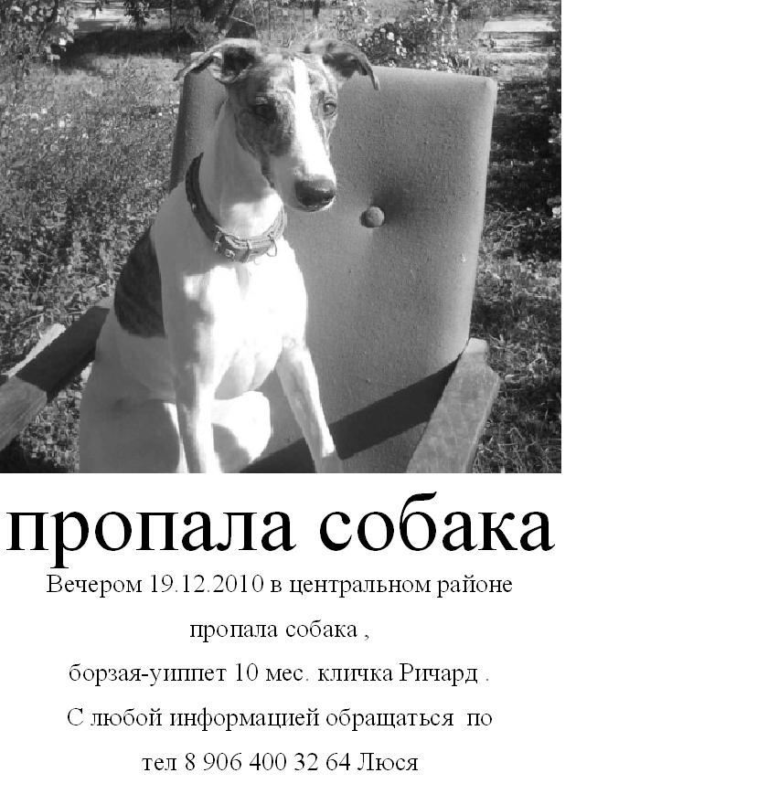 Van, сделайте листовку - фотография собаки, контактные данные владельца, просьба вернуть - и выложите здесь. Распечатаем, раскидаем в почтовые ящики, разошлем по знакомым. Если песу забрали, может прочитают листовку. Я бы сделала ,но руки не из того места, не смогу сделать ярко и заметно. А вот по центру распространить получится!