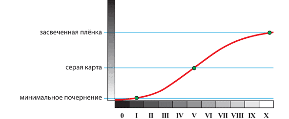 По горизонтали — яркости сюжета, согласно зонной системе Адамса, а по вертикали — собственно, плотности почернений. Максимальная плотность — это плотность засвеченной плёнки. Чернее ничего быть не может. Сюда попало максимум света. Этот «самый чёрный» чёрный, впрочем, может быть и светлосерым (недопроявление). И угольно-чёрным, через который можно смотреть на солнце, не боясь ослепнуть (перепроявление). Сделав ряд тестов методом научного тыка можно определить, сколько времени проявлять до «нужного чёрного», рекомендуемого производителем. Это время и будет нормальным временем проявления. Минимальное почернение — место, которое смогло зарегистрировать минимум света. То есть, вполне возможно, что на плёнку воздействовал свет более слабой интенсивности. Но, к сожалению, он никак не смог подействовать на соли серебра и после проявления никакого почернения не создал. Это, собственно, так называемая «точка светочувствительности». Контраст — это условная величина — тангенс угла наклона линейного участка графика. Во время теста мы не будем его вычислять, поскольку при правильной экспозиции и нормально-стандартном проявлении подразумевается, что величина контраста будет лежать в допустимых и комфортных для печати/сканирования пределах автоматически. Средняя точка на графике — это плотность серой карты — некоего эталона.