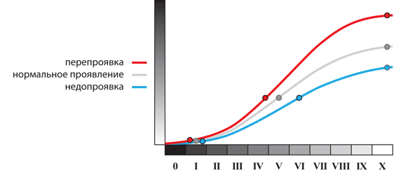 Для лучшего понимания я нарисовал на картинке ниже условные графики перепроявленной и недопроявленной плёнок. Видно, что при недопроявке точка максимальной плотности находится слишком низко, и на негативе должна выйти слишком серой, а при перепроявлении, наоборот, почернение весьма сильное. Также, видно, что контраст (угол наклона графика) меняется: при недопроявлении плёнка неконтрастная (мягкая), а при перепроявлении — наоборот. Точка серой шкалы сдвинулась на соседнюю ступень, а вот «точка светочувствительности» осталась практически на месте. Возможно, кстати, для кого-то будет открытием тот факт, что перепроявление (push) или недопроявка (pull) на самом деле практически не меняют истинную светочувствительность. Меняется только светочувствительность в светах и контраст. Итак, подводя резюме: нам нужно понять, сколько времени проявлять плёнку для достижения нормальной, рекомендованной производителем максимальной плотности. А потом определить какое количество света создаёт минимальное почернение.