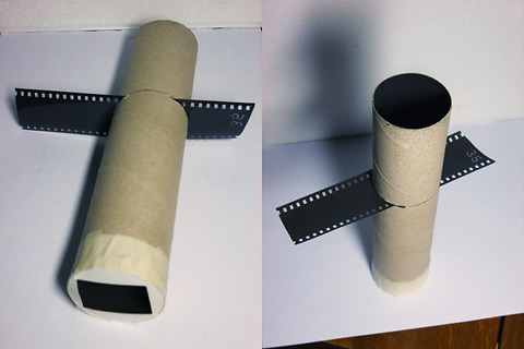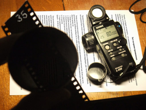 Теперь из пяти кусков нужно выбрать один с нужной максимальной плотностью. Чтобы визуально определить нужную максимальную плотность, я обычно делаю так: 1. Кладу на стол лист чистой белой офисной бумаги и освещаю его настольной лампой. 2. Замеряю экспонометром отражённый свет от бумаги. 3. И меняя высоту лампы добиваюсь, чтобы экспозиция была около 13 EV (125/8 при ISO 100). 4. Заменяю чистый лист на точно такой же, но с чётко напечатанным текстом размером примерно 12-14 пунктов. 5. Через проявленные кусочки плёнки рассматриваю лист бумаги с текстом. Расстояние от плёнки до бумаги — 30-40 см, от глаза до плёнки — вдвое меньше. При рассматривании тестов нужно максимально исключить влияние паразитного света. Я для этих целей сделал трубку-тубус с прорезью для плёнки, выкрашенную изнутри чёрной матовой краской: